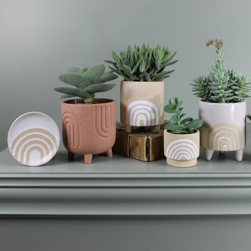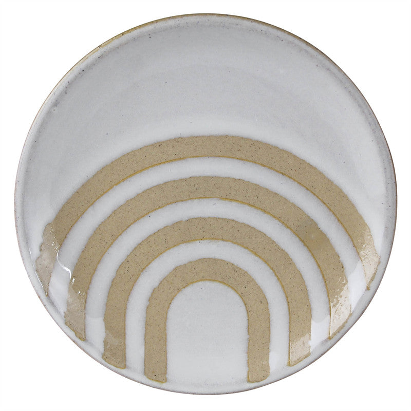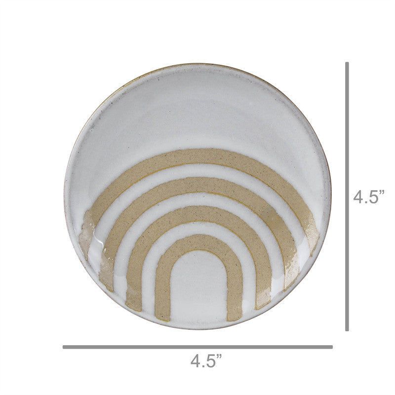 This round trays with a gloss white glaze over natural ceramic with a rainbow icon serve as a coaster or a place to catch coins, knick knacks and jewelry. Dimensions: 4.5 x 4.5 x 0.75