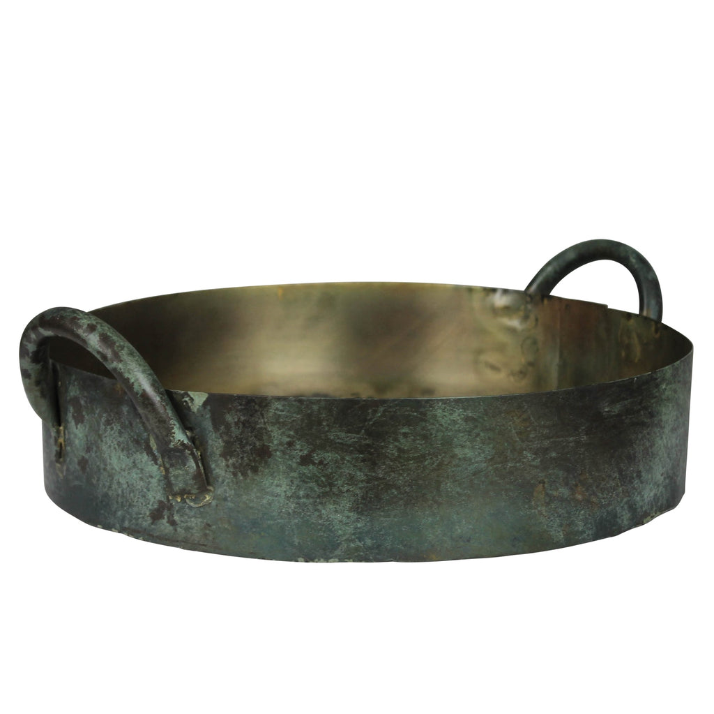 With high sides and sturdy handles this galvanized tray with a green patina finish lends itself perfectly to carrying beverages to a thirsty crowd. Dimensions: 13.5 x 12 x 3.75