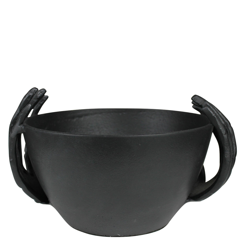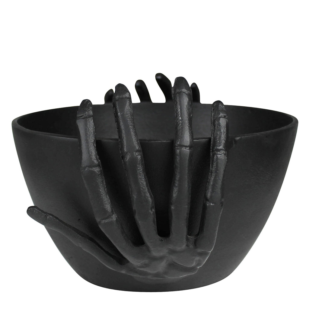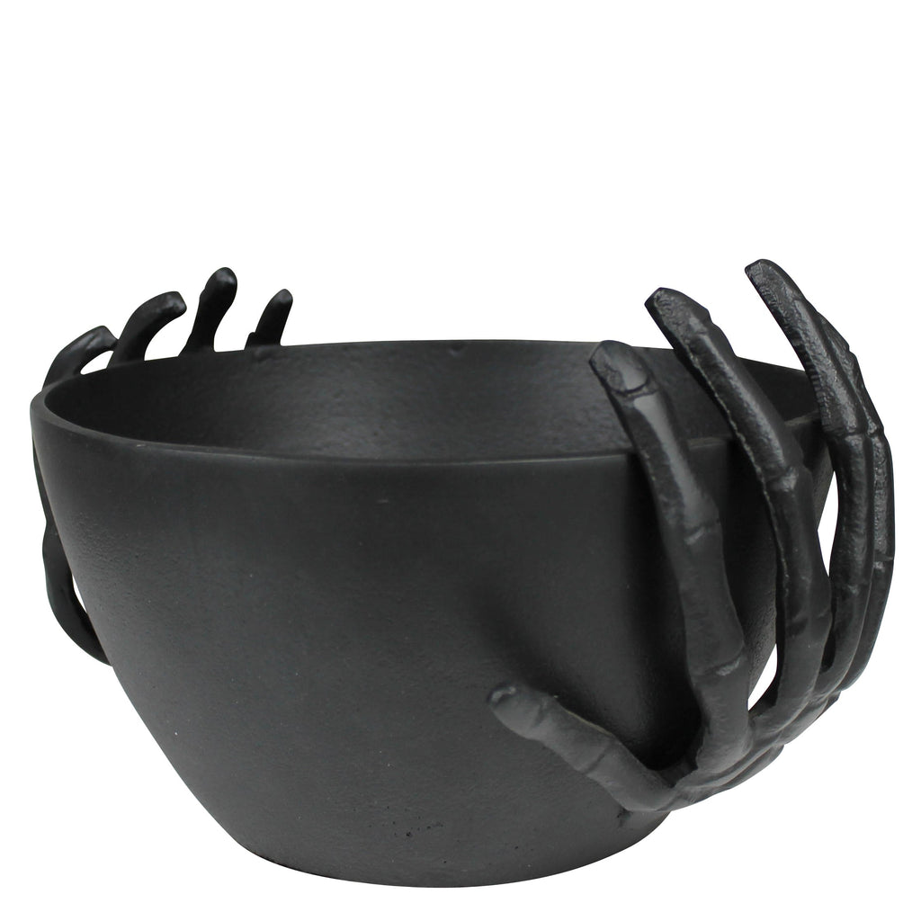 This frightfully fun piece is truly attention grabbing. Crafted of cast aluminum in a dark-as-night finish, two skeletal hands hold a bowl ready to be filled with tricks or treats and keep the mood oh-so spooky. .Dimensions: 10 x 8 x 6