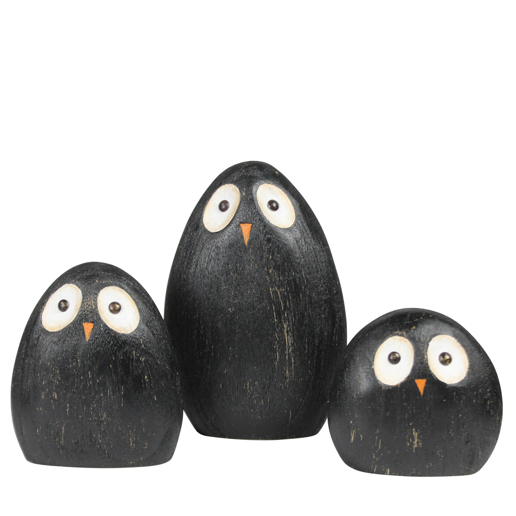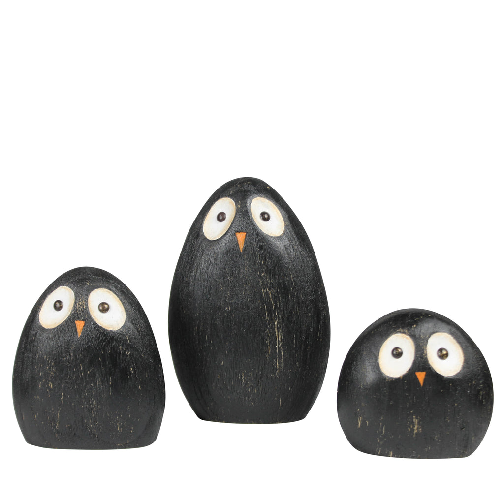 Elegantly carved and finished in black paint, this set of 3 owl figurines adds a sophisticated, timeless touch to any space. With intricate detailing and a modern design, they bring a perfect balance of nature-inspired charm and contemporary style. Set of 3: $, $9.50, $11, Sm: 5x2.5x4.5, Med: 5x2.5x6, Lrg: 6x2.5x8.5.Dimensions: 6 x 2.5 x 8.5