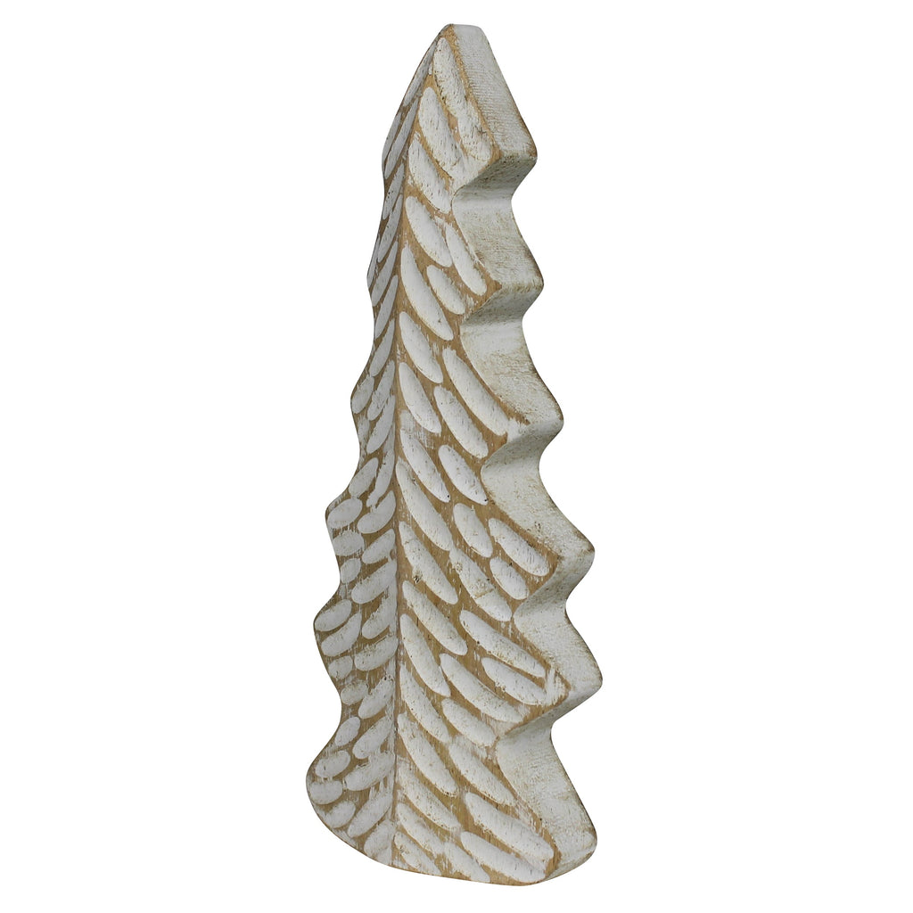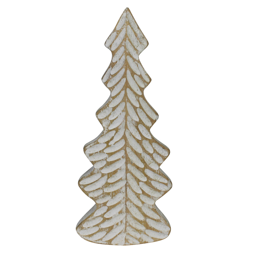 The limbs of this wood tree are hand carved and painted in a distressed white giving the feel of barren patches left from fallen snow. .Dimensions: 3.75 x 1.25 x 9
