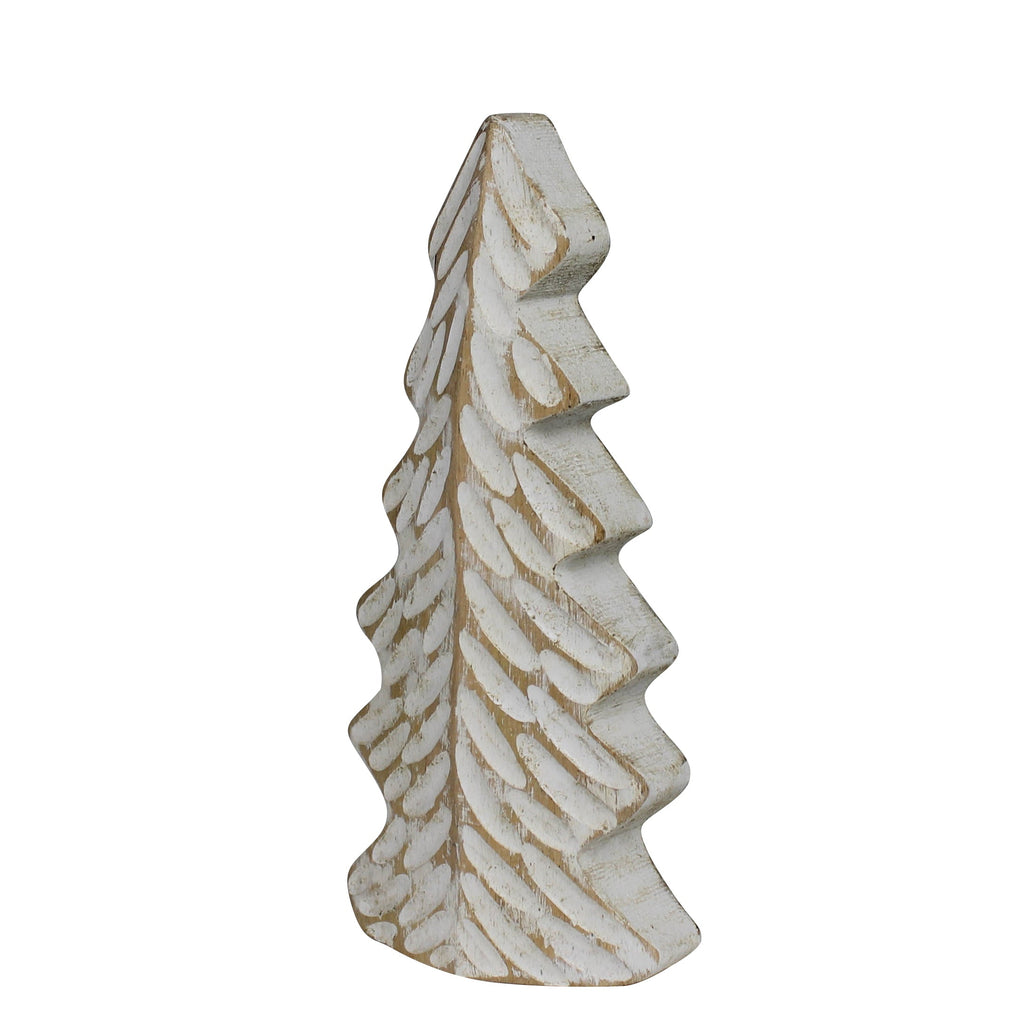 The limbs of this wood tree are hand carved and painted in a distressed white giving the feel of barren patches left from fallen snow. .Dimensions: 3.25 x 1.25 x 7.25