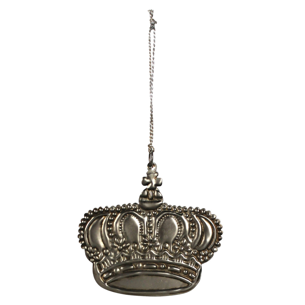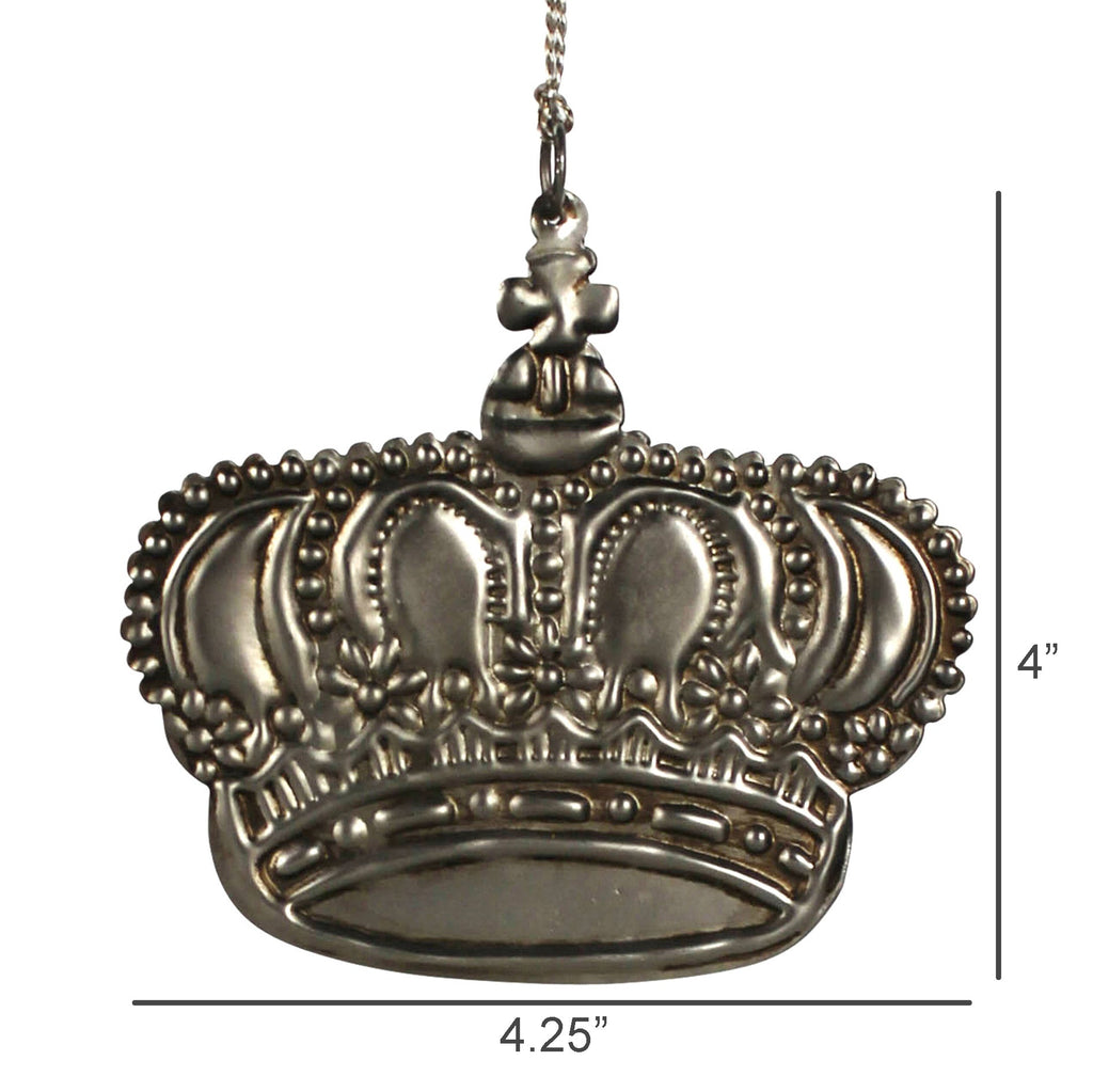 Pressed of metal with an antique silver finish, this crown ornament is a truly striking object. Strong details and deeply intrinsic meanings bring life into any space. .Dimensions: 4.25 x 0.1250 x 4
