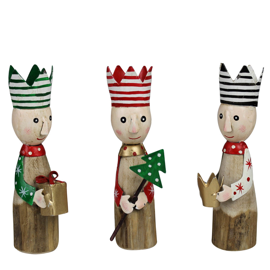 Carved from wood with hand painted metal details this set of 3 festive kings add a touch of sweetness to holiday décor. .Dimensions: 1 x 2 x 5
