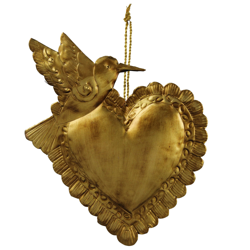 Pressed of metal and plated with brass, this sacred heart which has been touched by the magic of a hummingbird is a truly striking object. Strong details and deeply intrinsic meanings bring life into any space. .Dimensions: 7 x 0.5 x 8.5
