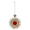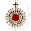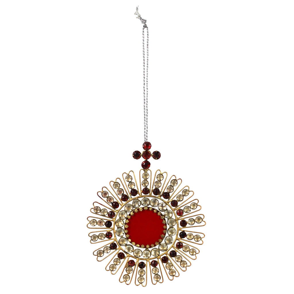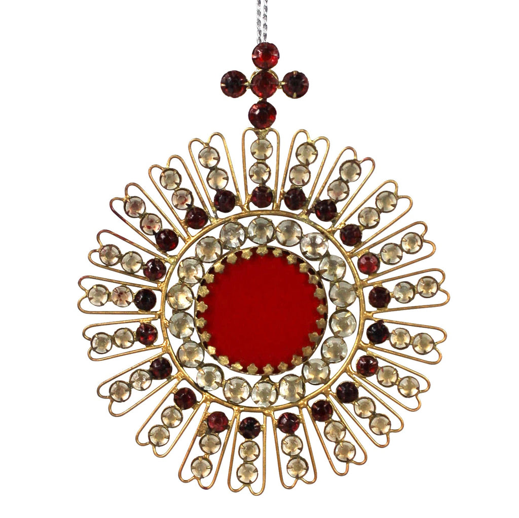 Garnet and clear faux gems are set into facets surrounding an enamel center, creating a unique medallion. .Dimensions: 5 x 0.25 x 6