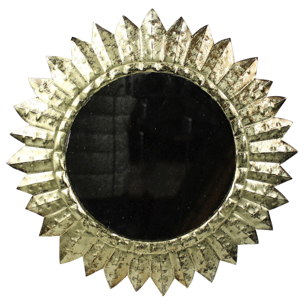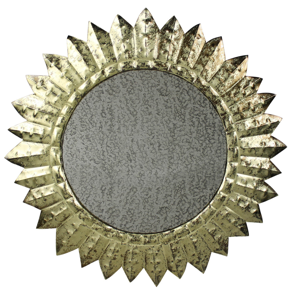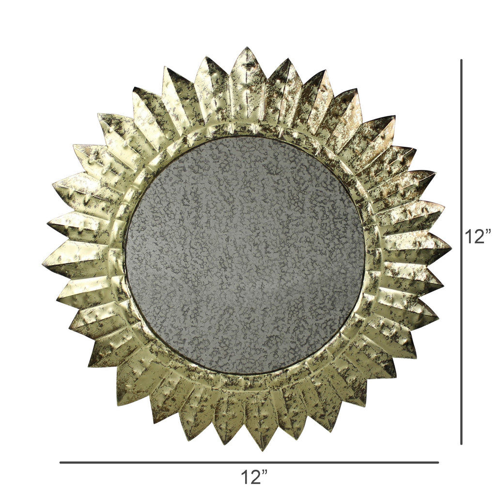 Crafted of hand forged metal with antiqued brass finishing this mirror draws and reflects light creating a celestial statement in the home. .Dimensions: 12 x 0.5 x 12