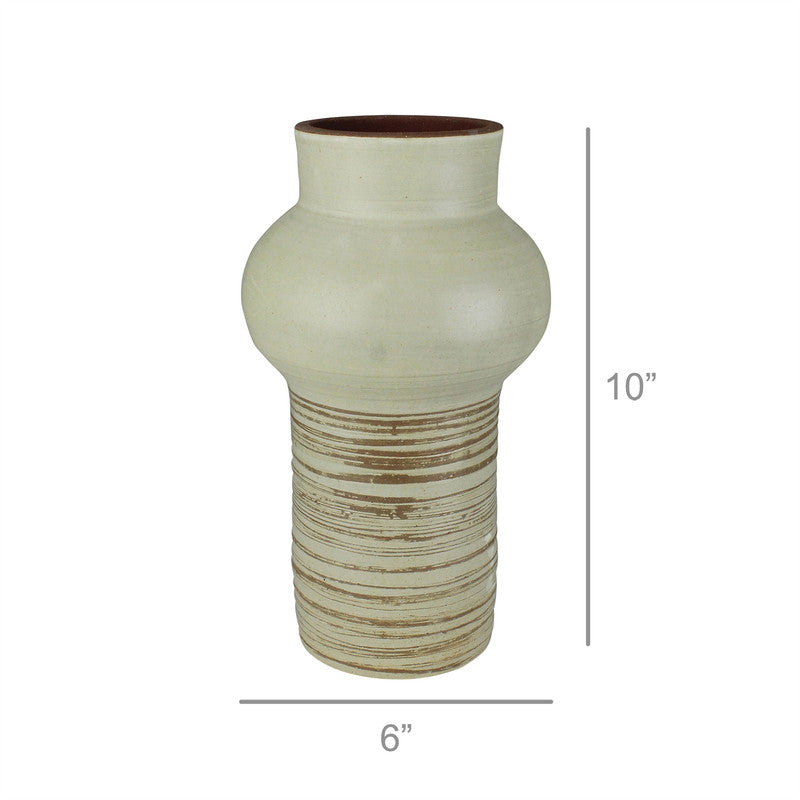 Crafted of stoneware and high fired in a traditional dragon kiln this statement worthy vase in an ancient yet modern shape looks lovely all on its own yet equally great with an earthy floral arrangement. Dimensions: 6 x 6 x 10