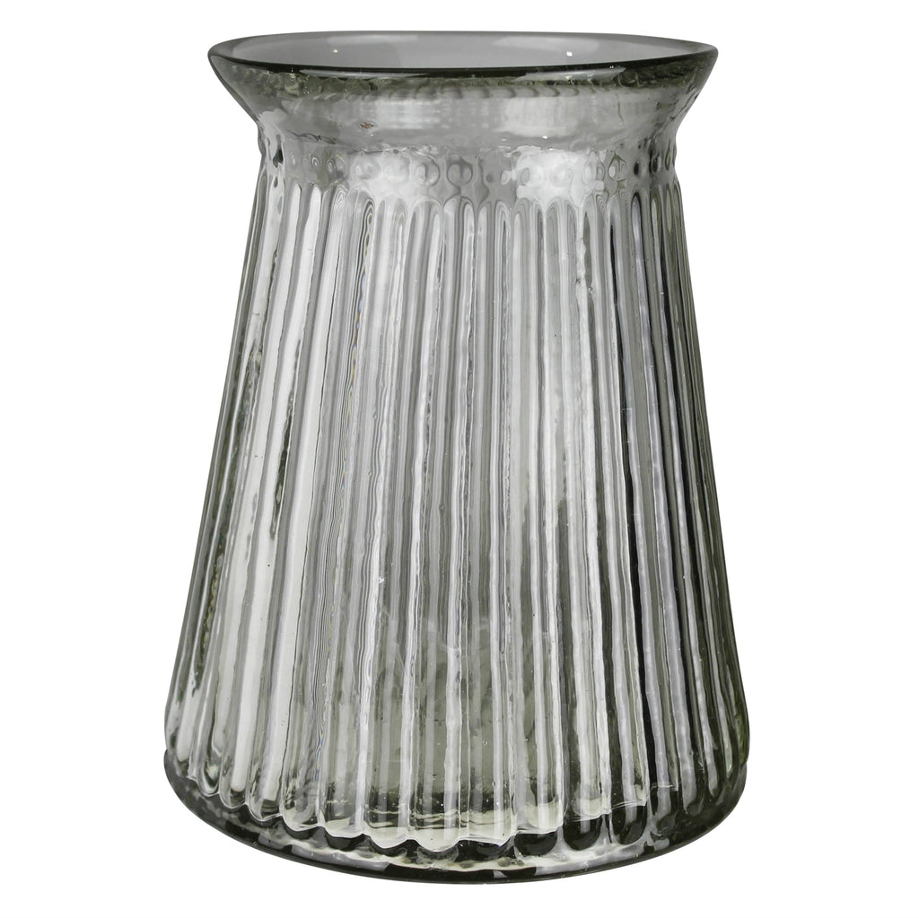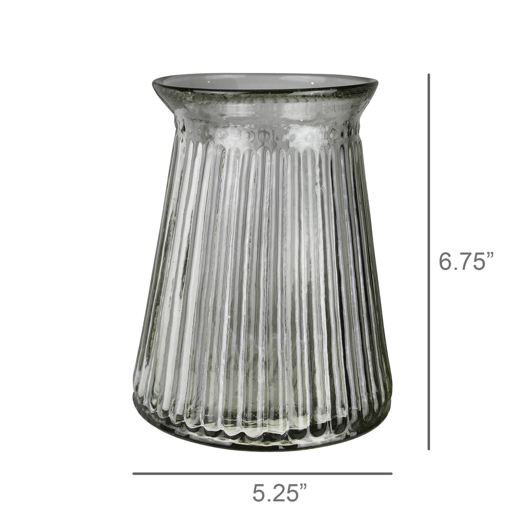 The ideal size for a variety of flowers, this simple yet sophisticated glass vase offers a sturdy vessel with modern ribbed texture. Dimensions: 5.25 x 5.25 x 6.75