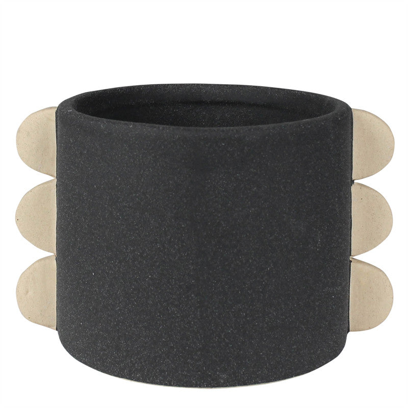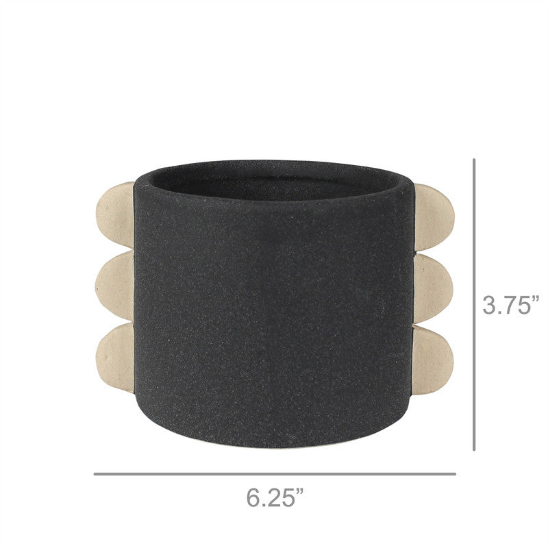 This global-chic cachepot in duo tone matte ceramic and stand-out statement side detail is in the perfect palette to be filled with a colorful potted plant. Sized for 4” drop-in pot. Dimensions: 6.25 x 5 x 3.75