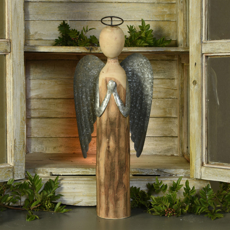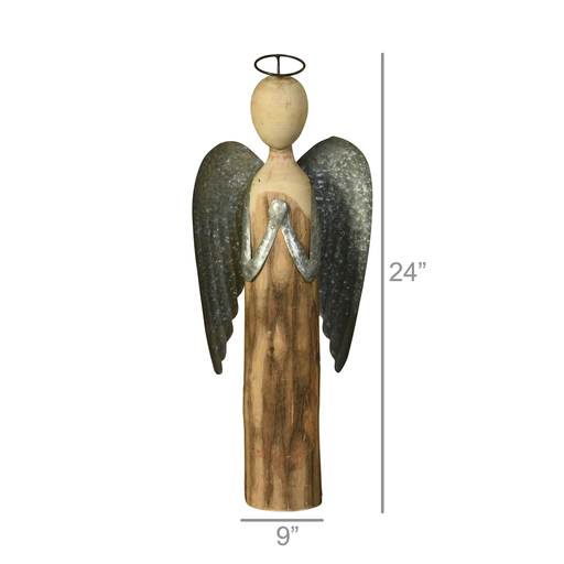 Sweet and soulful, our angels are crafted out of wood and galvanized metal, each offering their very own Christmas sentiment in the gifts of prayer, light and love. Dimensions: 9 x 4 x 24