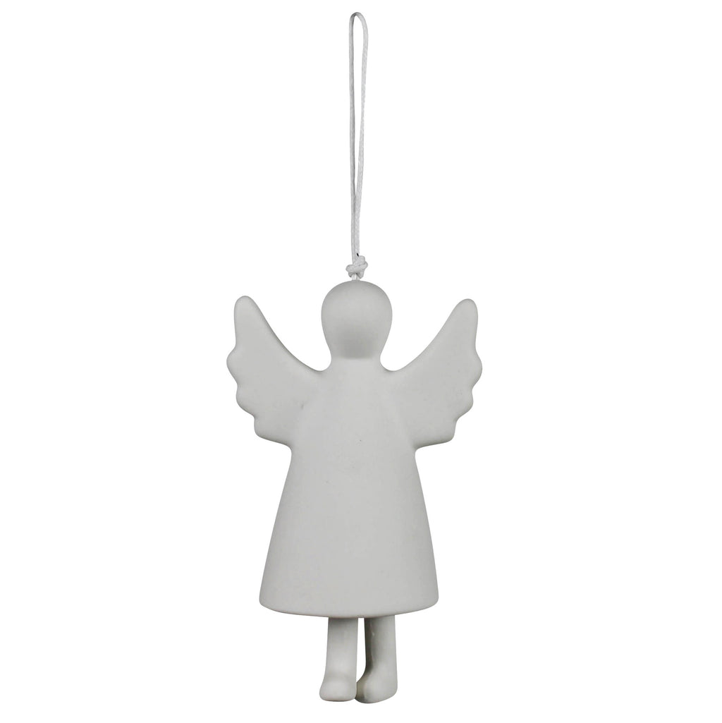 Embrace the seasonal enchantment with this Angel ornament crafted in a bisque white porcelain with a minimal profile. The legs swing gently lending a tiny ding as she radiates holiday peace and joy.