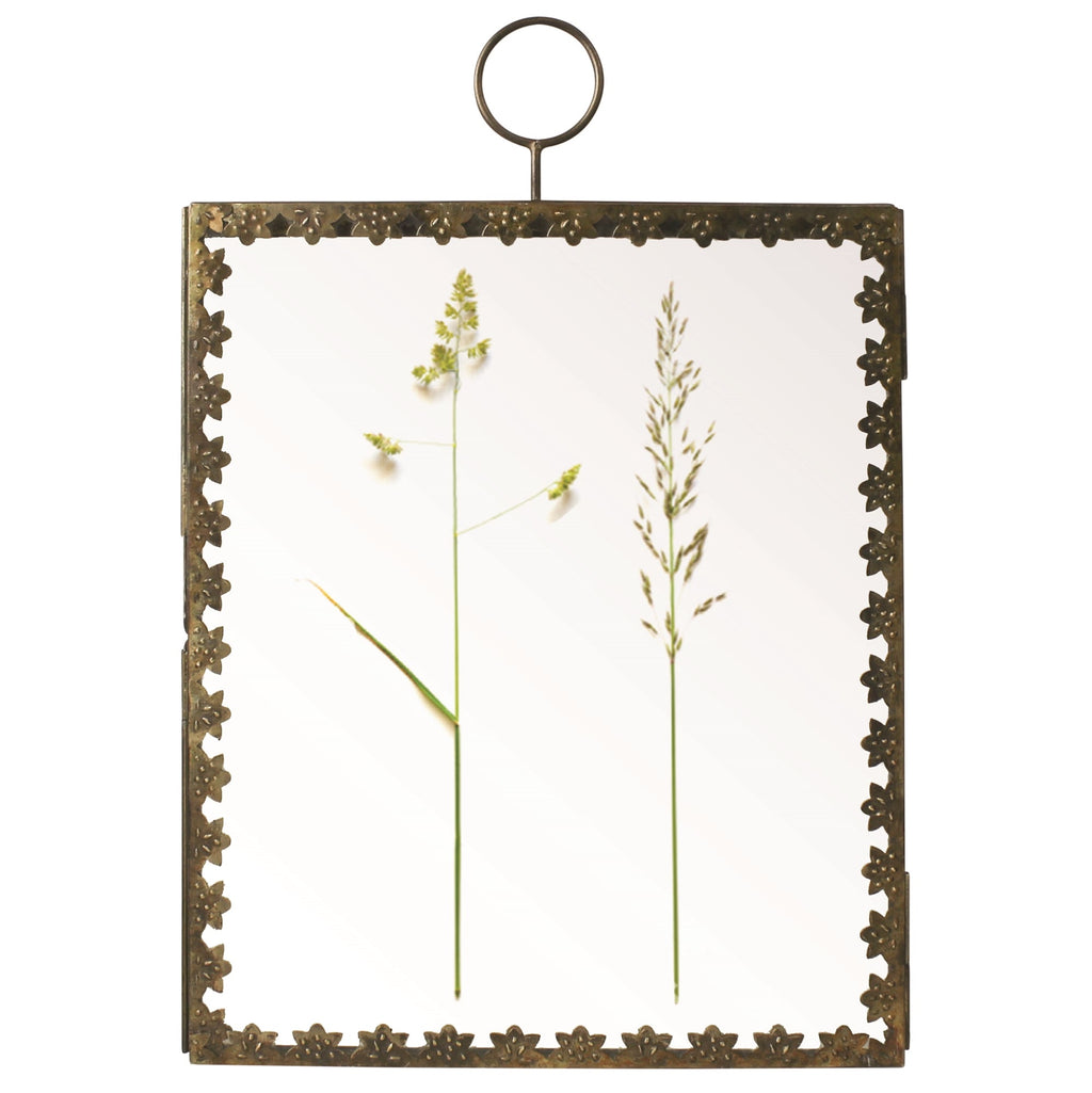 Clean lines meld with a textured boarder in our wall frames crafted from brass and glass. These frames have a hinged opening for easy placement of a photograph or floral for pressing. Hangs from a 1.5” round hanger. .Dimensions: 8 x 0.5 x 10