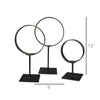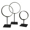 The simple form of an iron ring is elevated to sculptural when mounted onto a stand and clustered as a trio. Perfect on a bookshelf, equally ideal on a table. Set of 3: $18, $19, $21, Sm: 4x4x8, Med: 4x4x11, Lrg: 4x4x13.Dimensions: 4 x 4 x 13