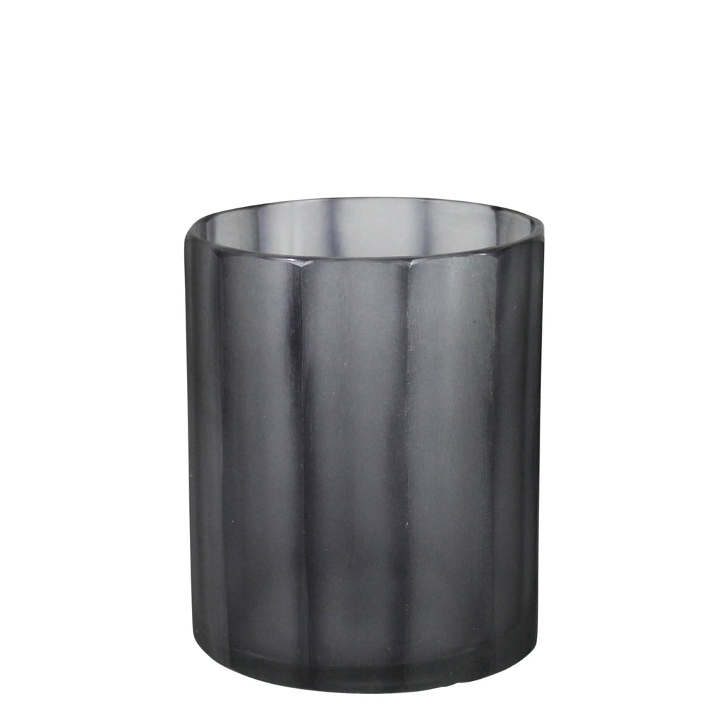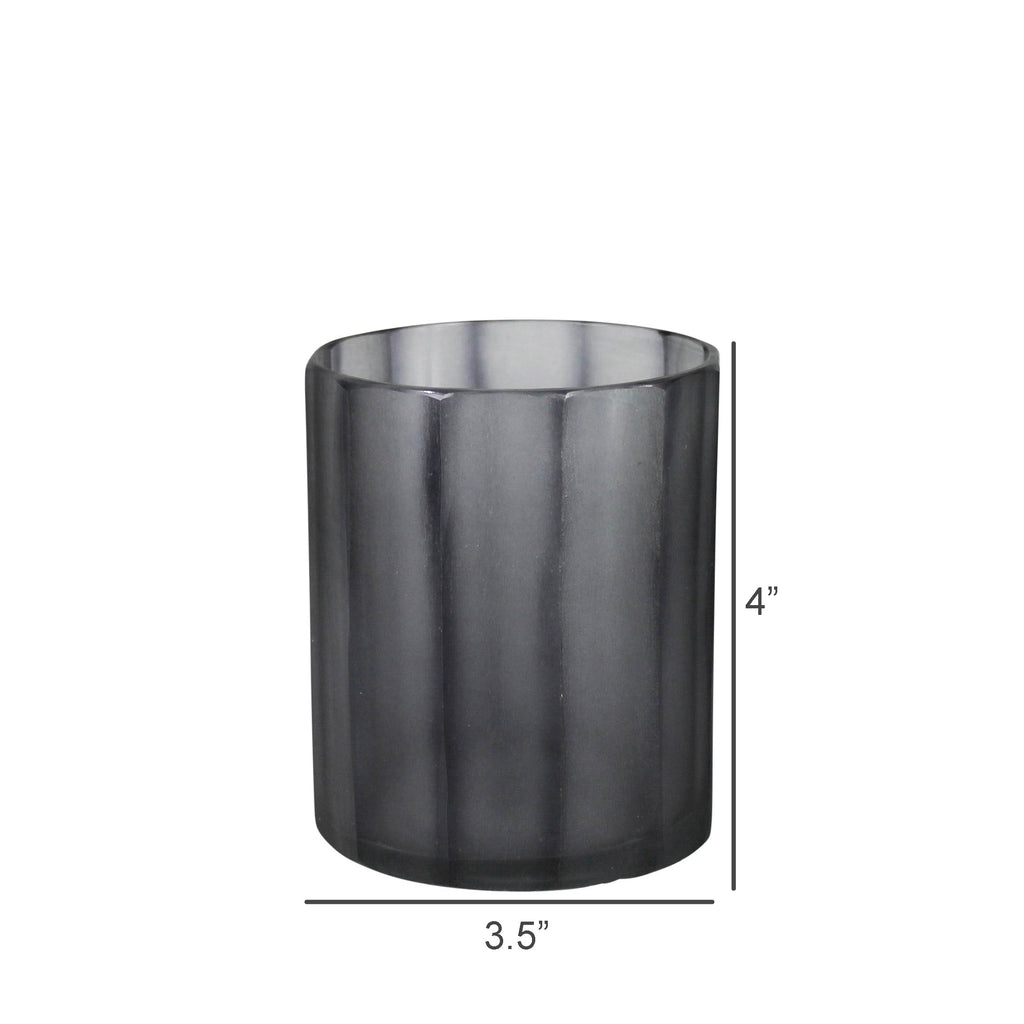 This glass vase features a timeless shape and semi-transparent blue colored glass. Dynamic hand cut detail offering a beautiful texture throughout. .Dimensions: 3.5 x 3.5 x 4