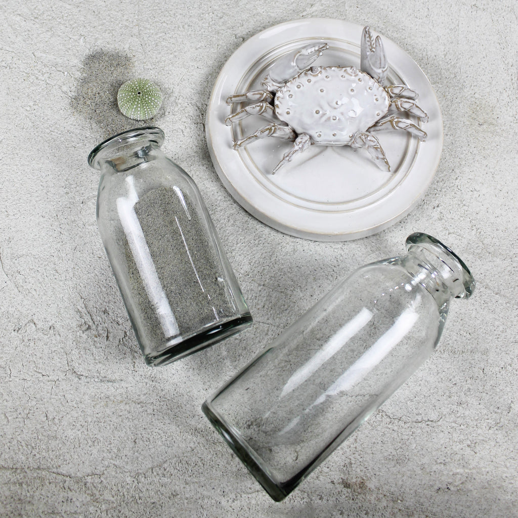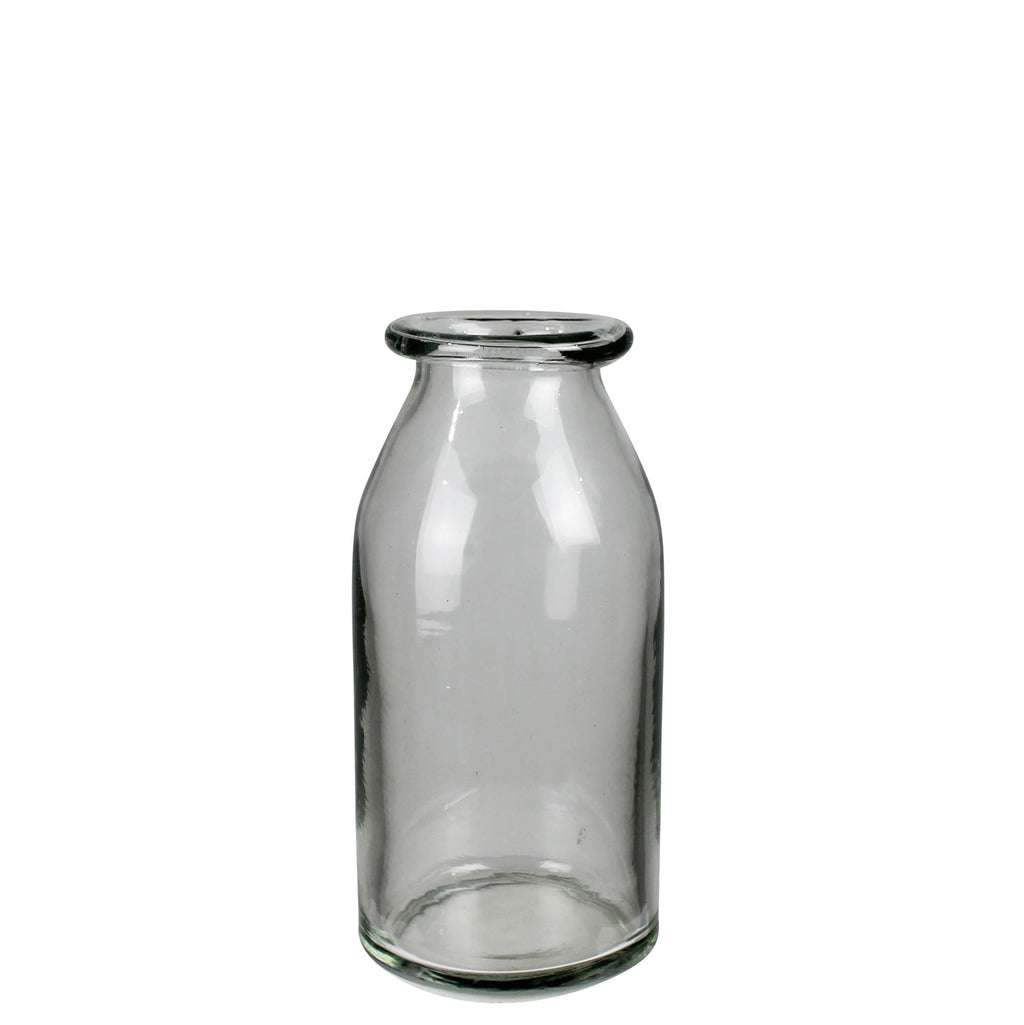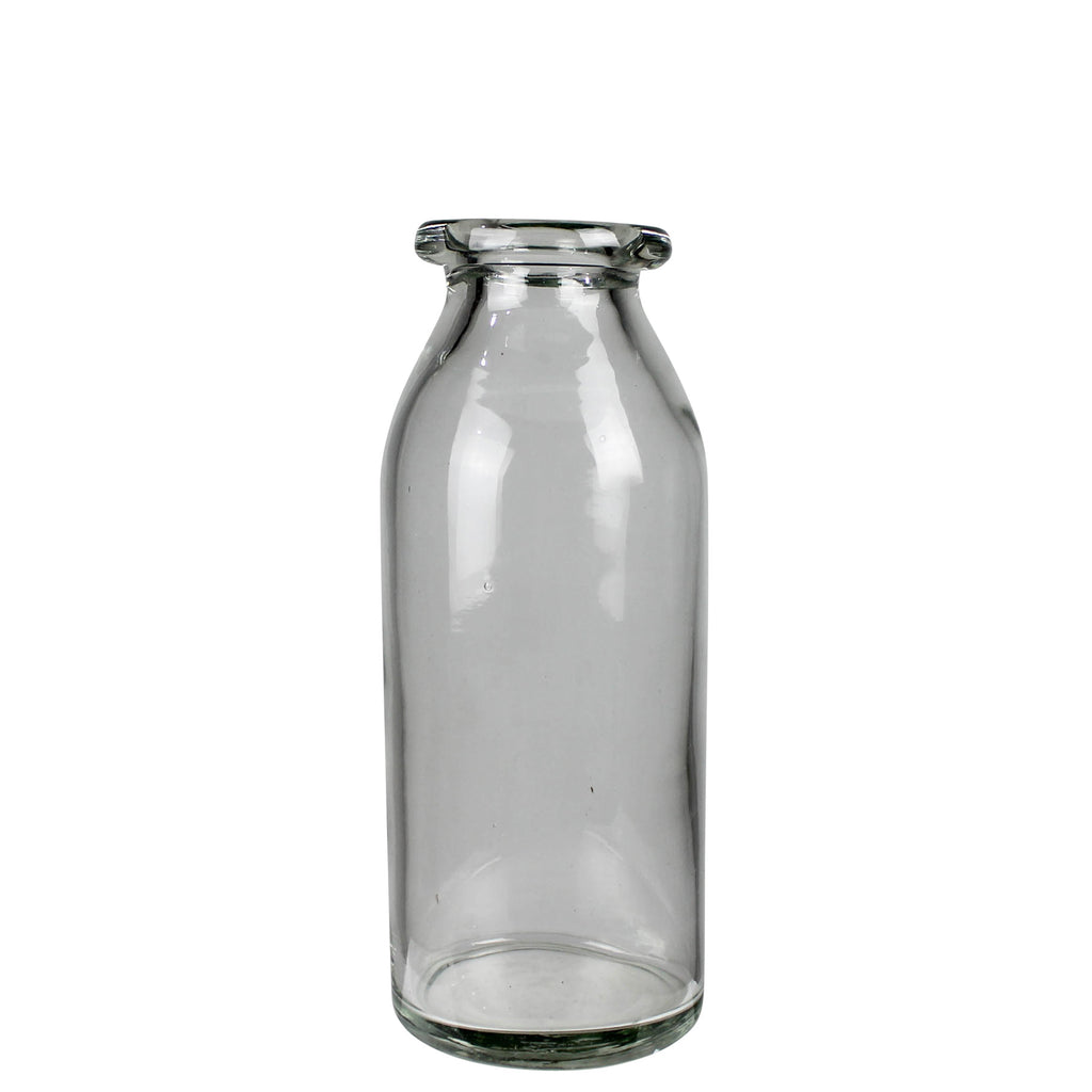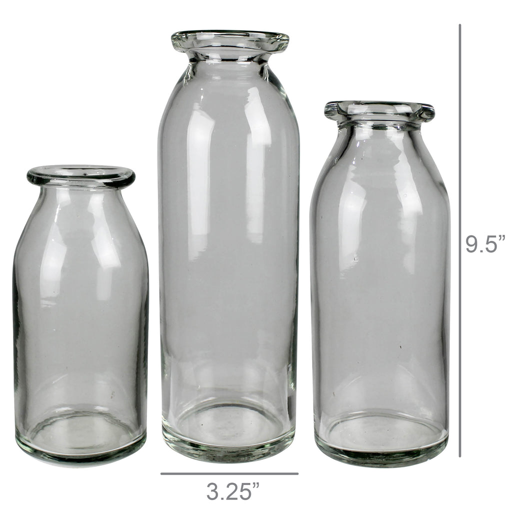 A trio of glass vases, each with a hand-rolled rim for a touch of handmade charm. Perfect for showcasing your favorite blooms or adding a subtle elegance to any space with their delightful craftsmanship. Dimensions 3.25 x 3.25 x 9.5