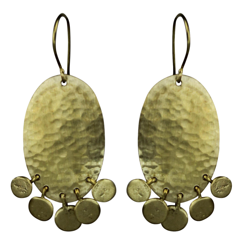 A pair of hammered brass earrings shaped like dewdrops. The textured finish and warm metallic tone offer a refined, elegant touch, capturing the subtle beauty of nature in a striking and timeless accessory. .Dimensions: 1 x 0 x 1.5