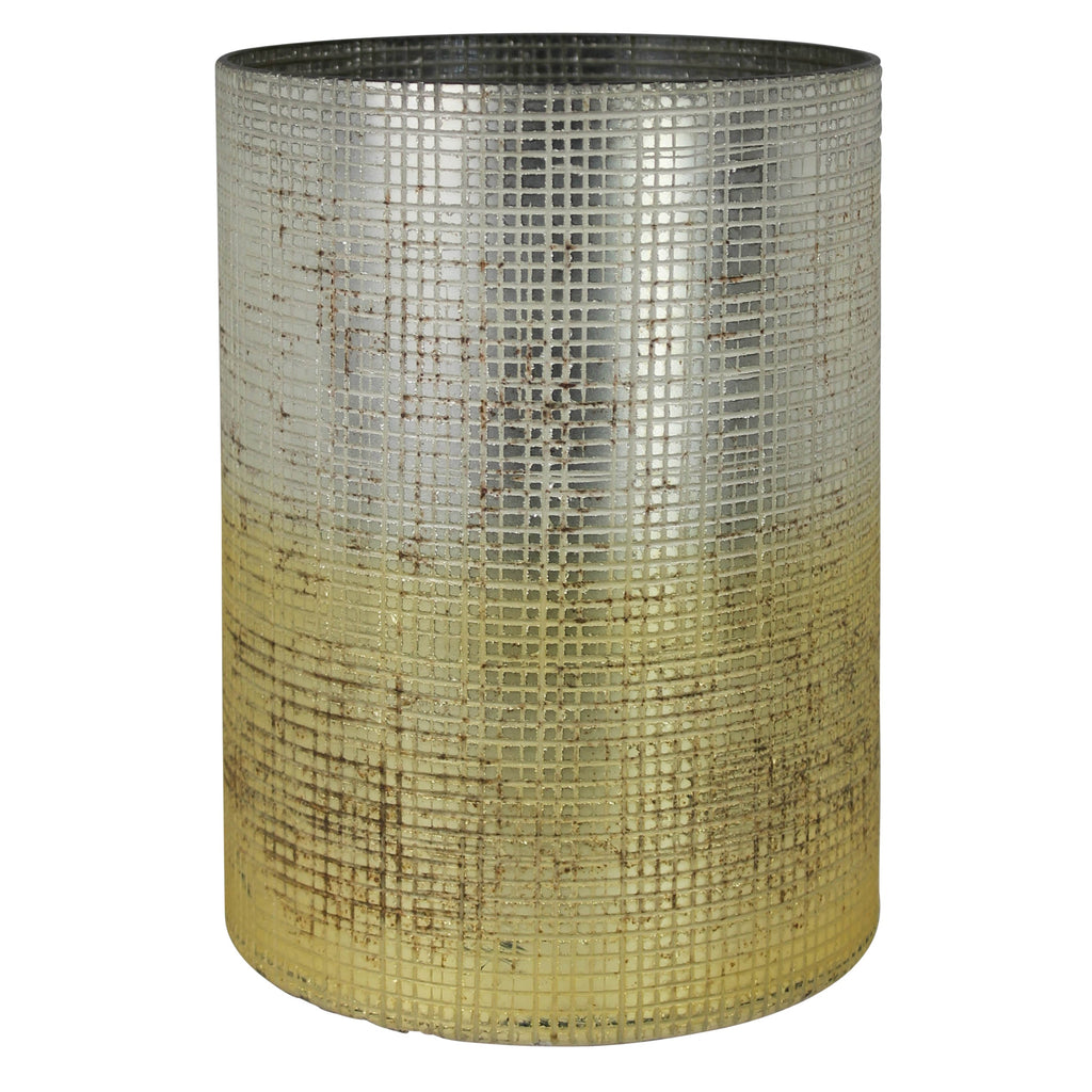 A modern cylindrical etched hurricane in silver and gold, featuring intricate detailing that adds texture and sophistication. Its elegant design creates a soft, ambient glow with candles, bringing a touch of luxury and warmth to any space. .Dimensions: 6 x 6 x 7.75