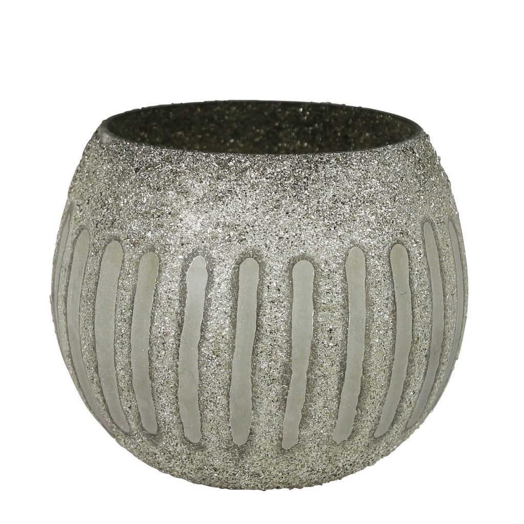 A modern round etched hurricane in silver, featuring intricate detailing that adds texture and sophistication. Its sleek, minimalist design creates a soft, ambient glow with candles, bringing a touch of elegance and warmth to any space. .Dimensions: 6 x 6 x 5.25