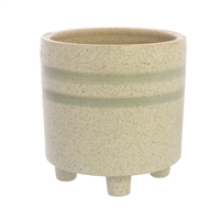 A white speckled glaze is complimented by translucent hand painted stripes of celadon green. Water tight for floral or plants. Dimensions: 6 x 6 x 6.25