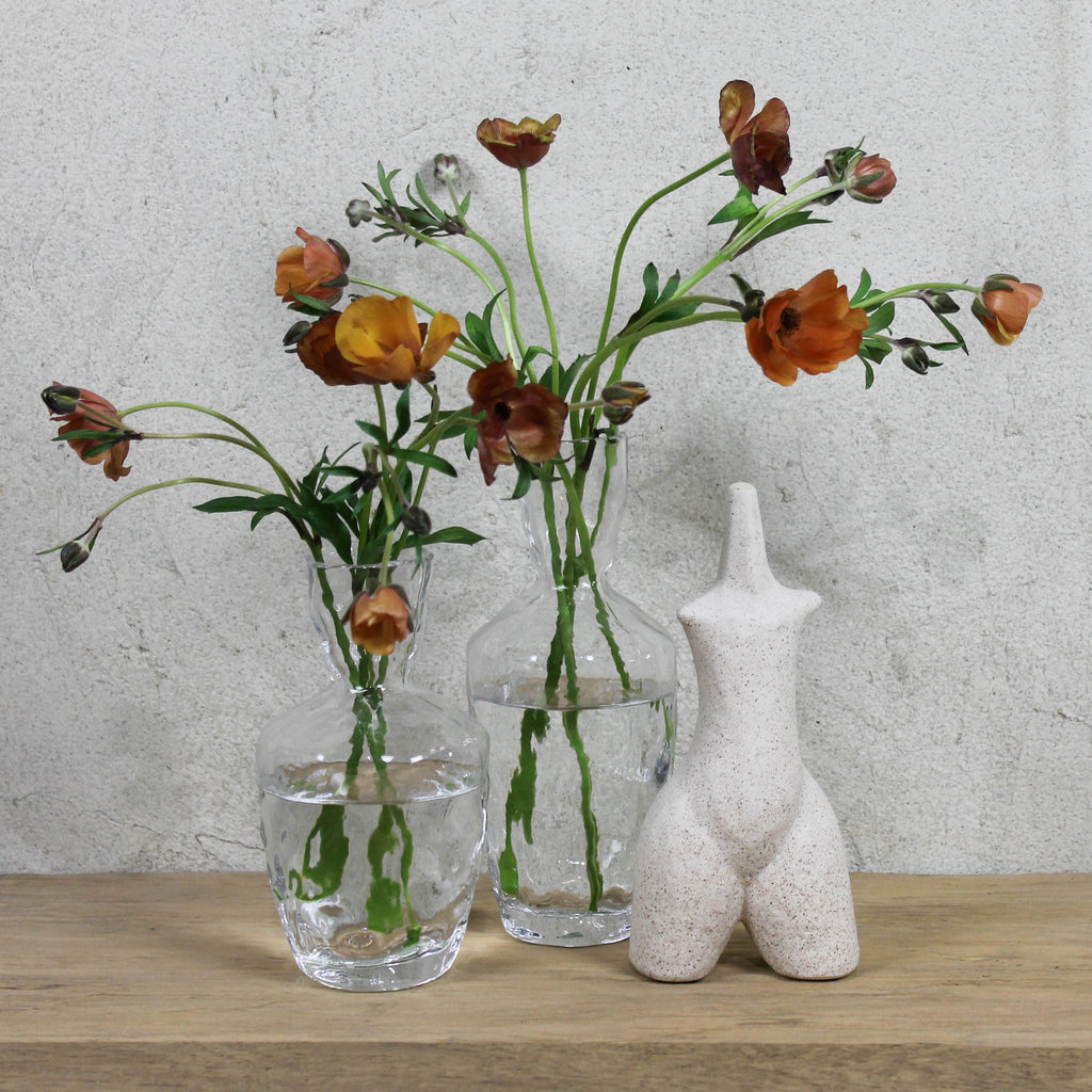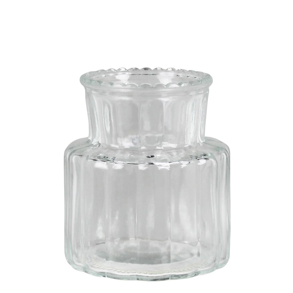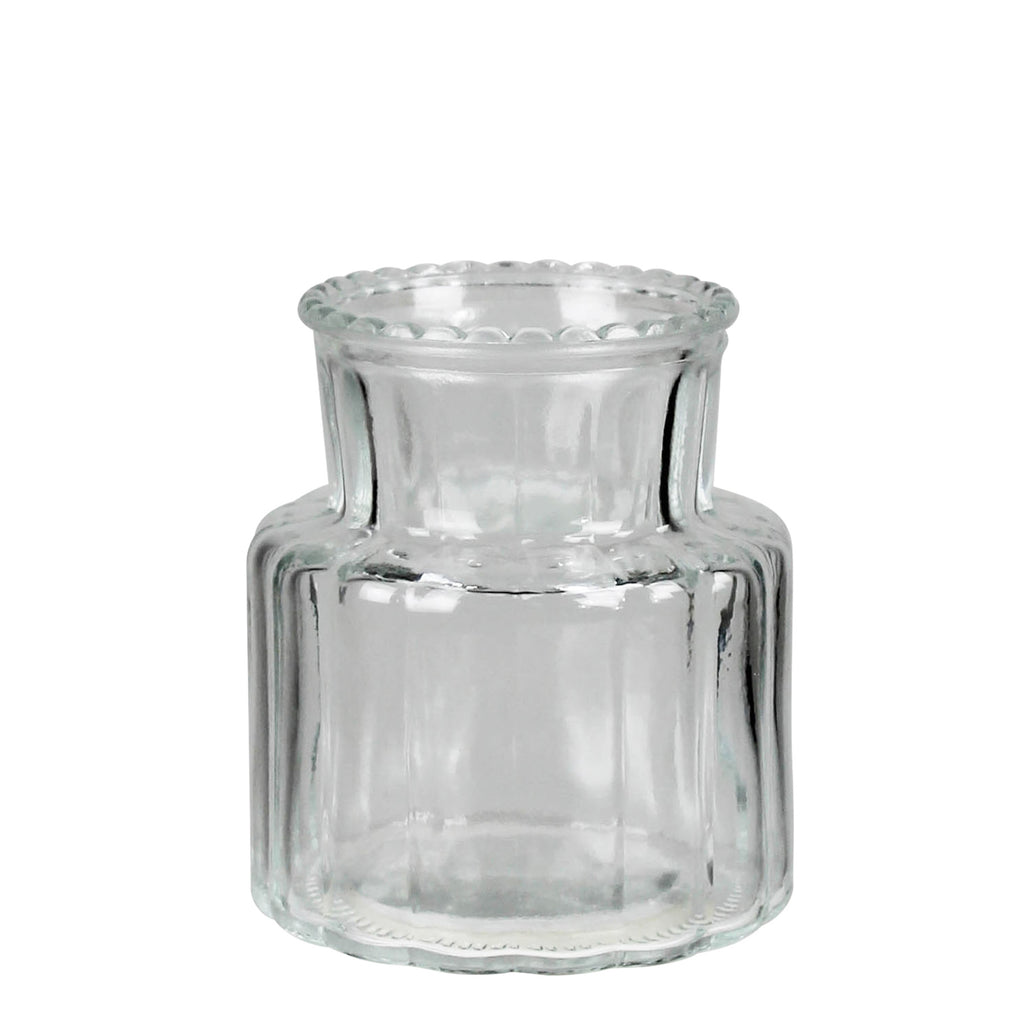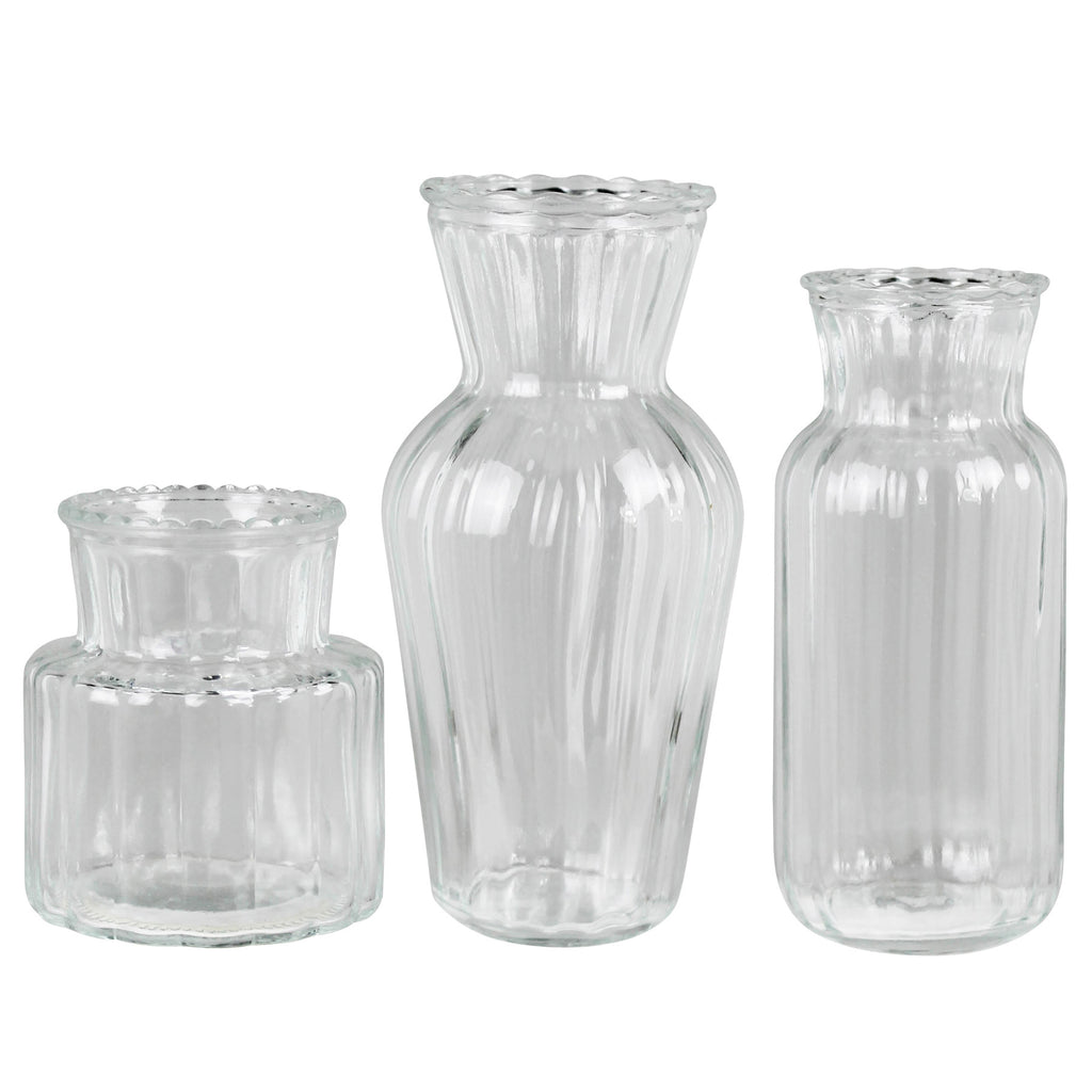 A trio of small glass vases, each uniquely textured for a touch of artistic charm. Perfect for showcasing your favorite blooms or adding a subtle elegance to any space with their delightful craftsmanship. Dimensions 3 x 3 x 6