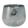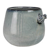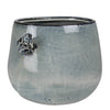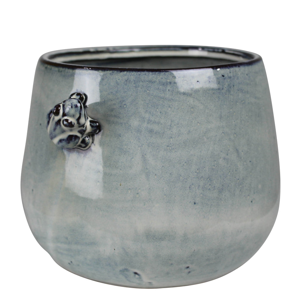 Add a touch of garden whimsy to any potted plant, an alert frog perches on the top of this cachepot made using dark clay with a reactive white glaze. Sized for a 6” drop-in pot. .Dimensions: 8 x 7 x 6