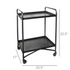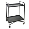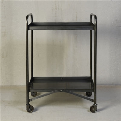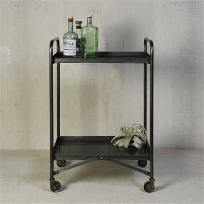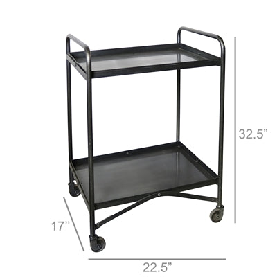 An appealing balance of form and function, the metal frame of this petite sized bar cart supports two metal trays to keep items in place – from barware to bath, from books to collectables. .Dimensions: 22.5 x 17 x 32.5