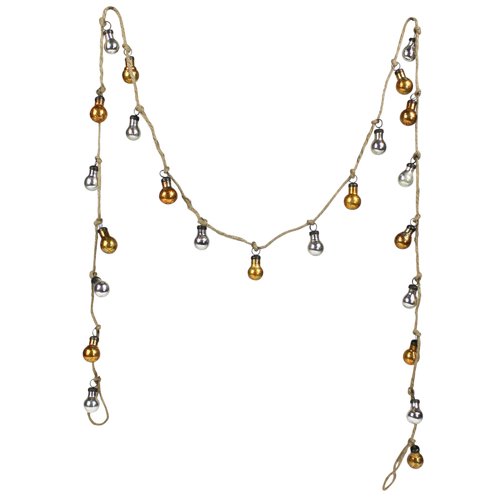 Spark the wonder of holiday nostalgia anew with our vintage inspired garland. Antique glass ornaments in gold and silver are strung on jute creating a warm and rustic accent. Dimensions 60 x 1 x 1