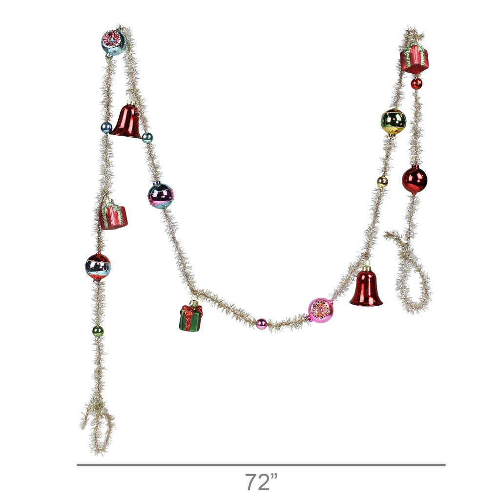 Spark the wonder of holiday nostalgia anew with our vintage inspired glass ornament and gold tinsel garland. Dimensions 72 x 1.75 x 2