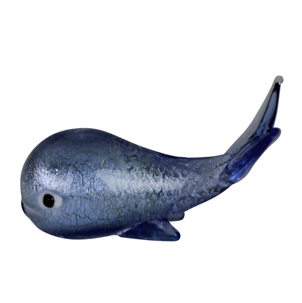 Dark blue glass whale sculpture, elegantly crafted to capture the fluidity and grace of the ocean. Its smooth, vibrant finish adds a artistic touch to any space, making it a striking decorative piece that evokes a sense of serenity and movement. .Dimensions: 2 x 1 x 1