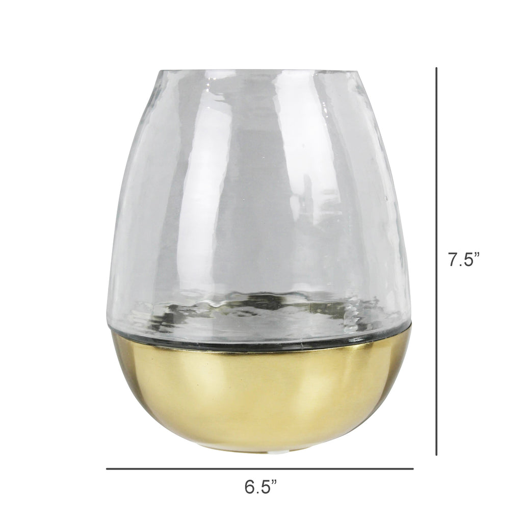 A large glass hurricane with a modern design, featuring hammered texture glass and a brass base. Ideal for both indoor and outdoor use, its sleek, contemporary style adds sophistication, perfect for creating a warm, inviting glow. .Dimensions: 6.5 x 6.5 x 7.5