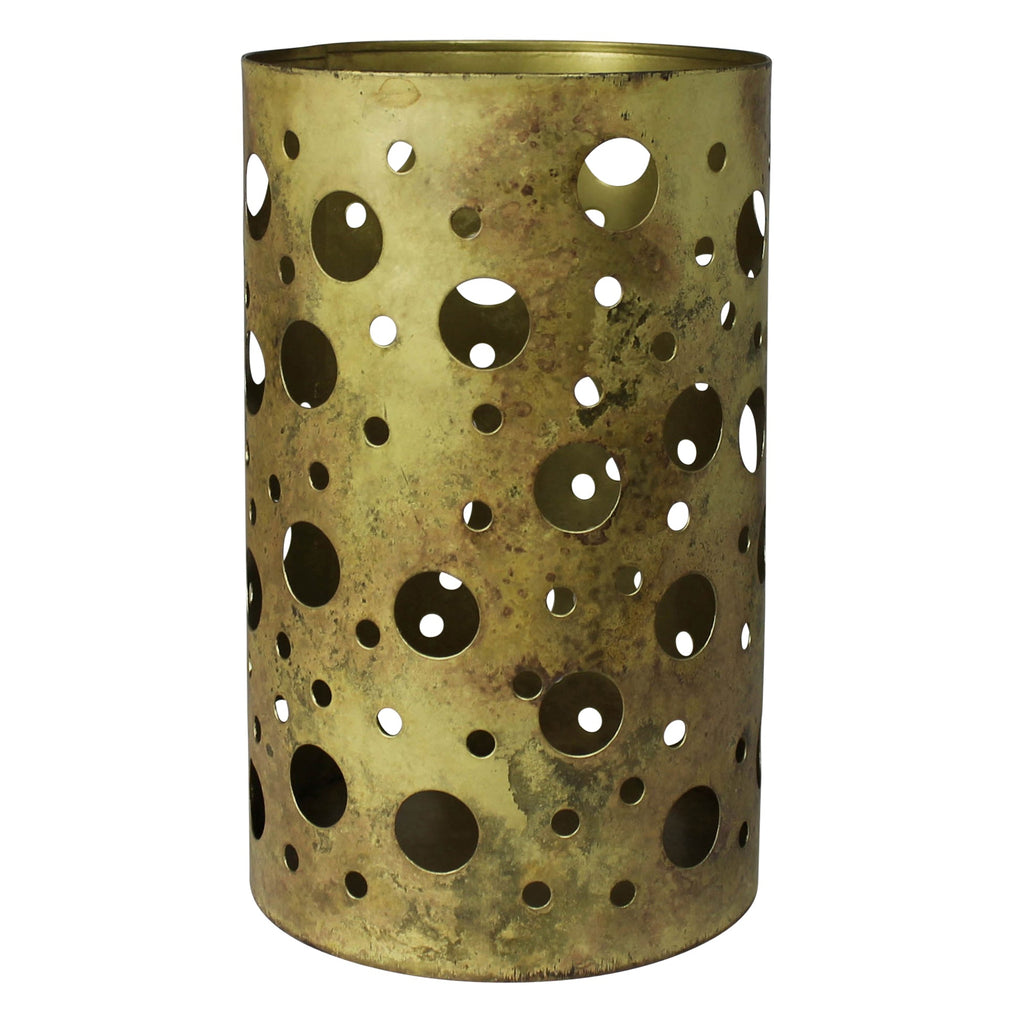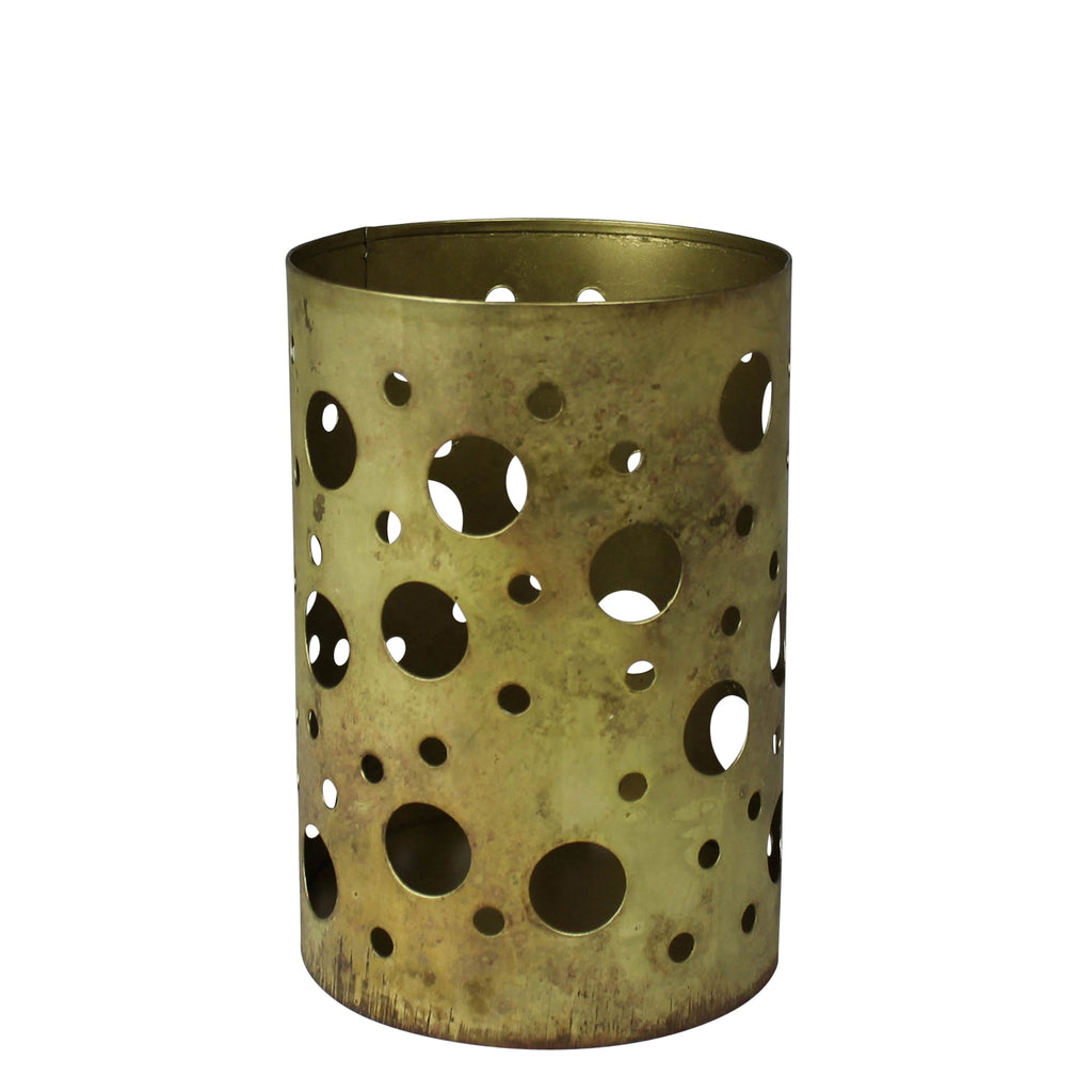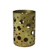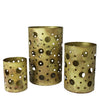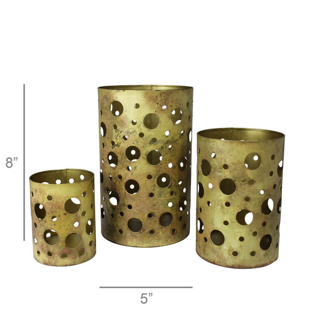 Antique brass finishing enrobes this set of three, perforated metal hurricanes. Amassed in a group, this trio bounces flickering candlelight off one another. Sm: 3x3x4, Med: 4x4x6, Lrg: 5x5x8.Dimensions: 5 x 5 x 8