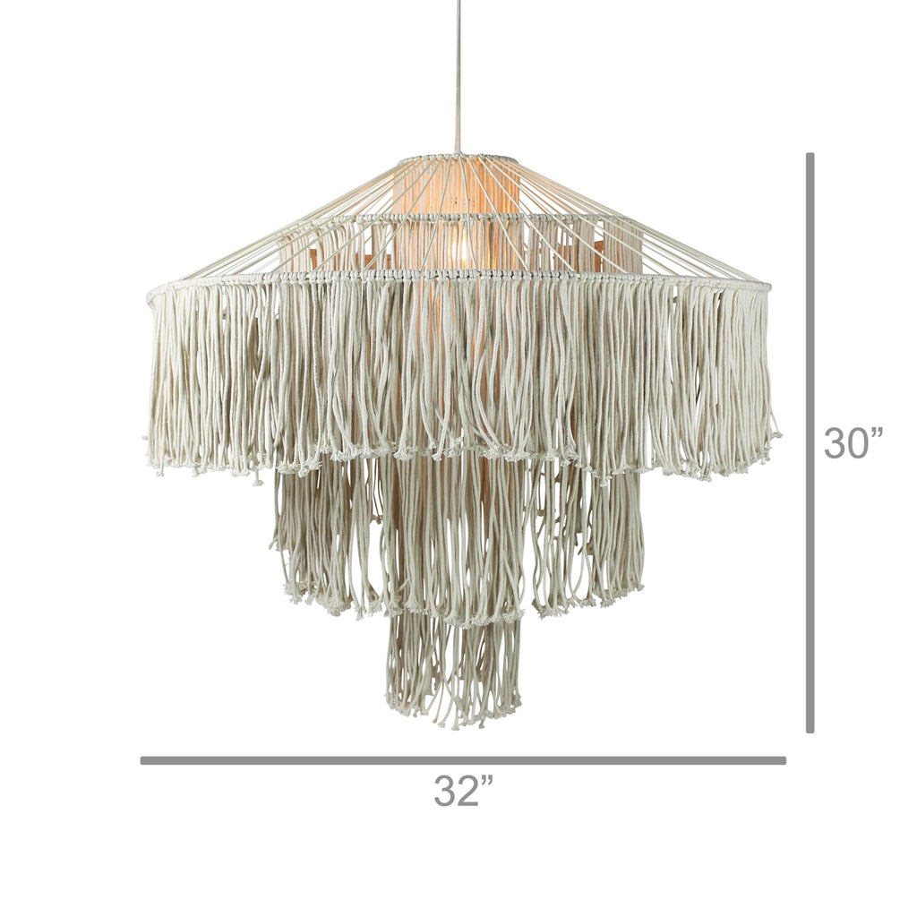 Cotton rope is tied in varying lengths around a metal frame creating a boho-chic pendant lamp. 5' foot cloth wrapped cord. Light bulb not included. Dimensions: 32 x 32 x 30