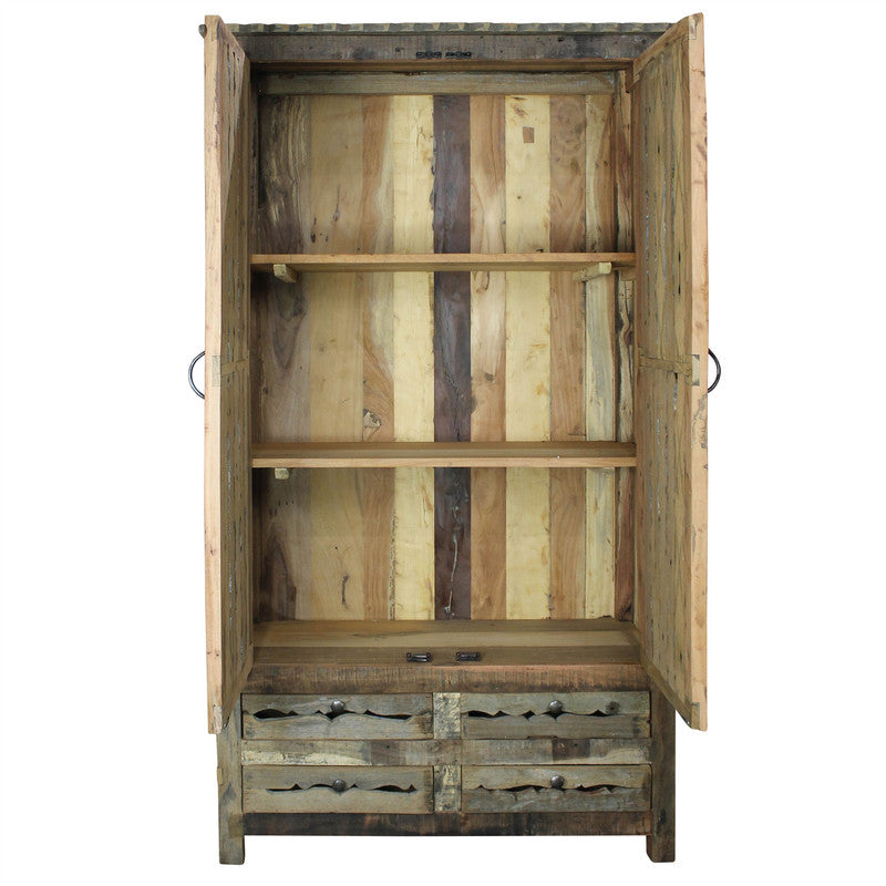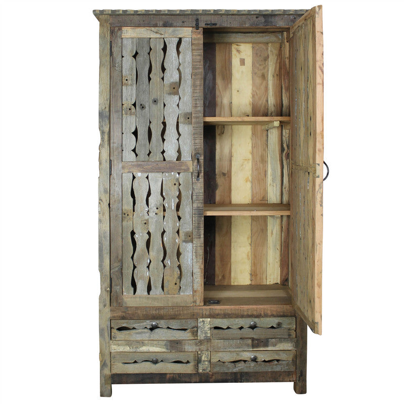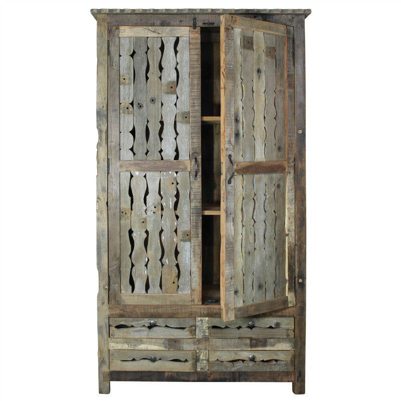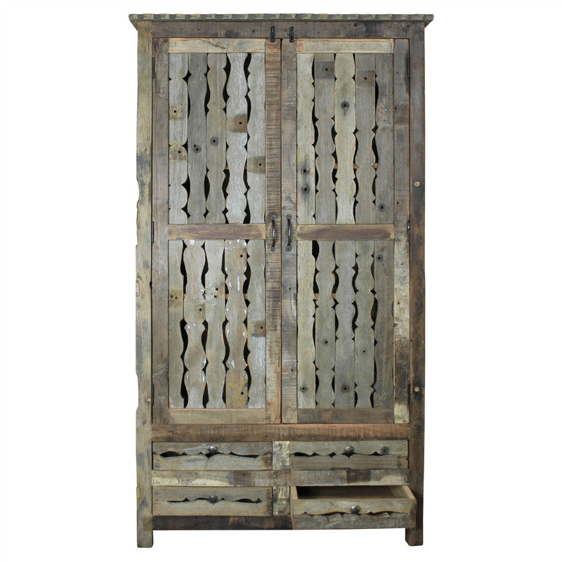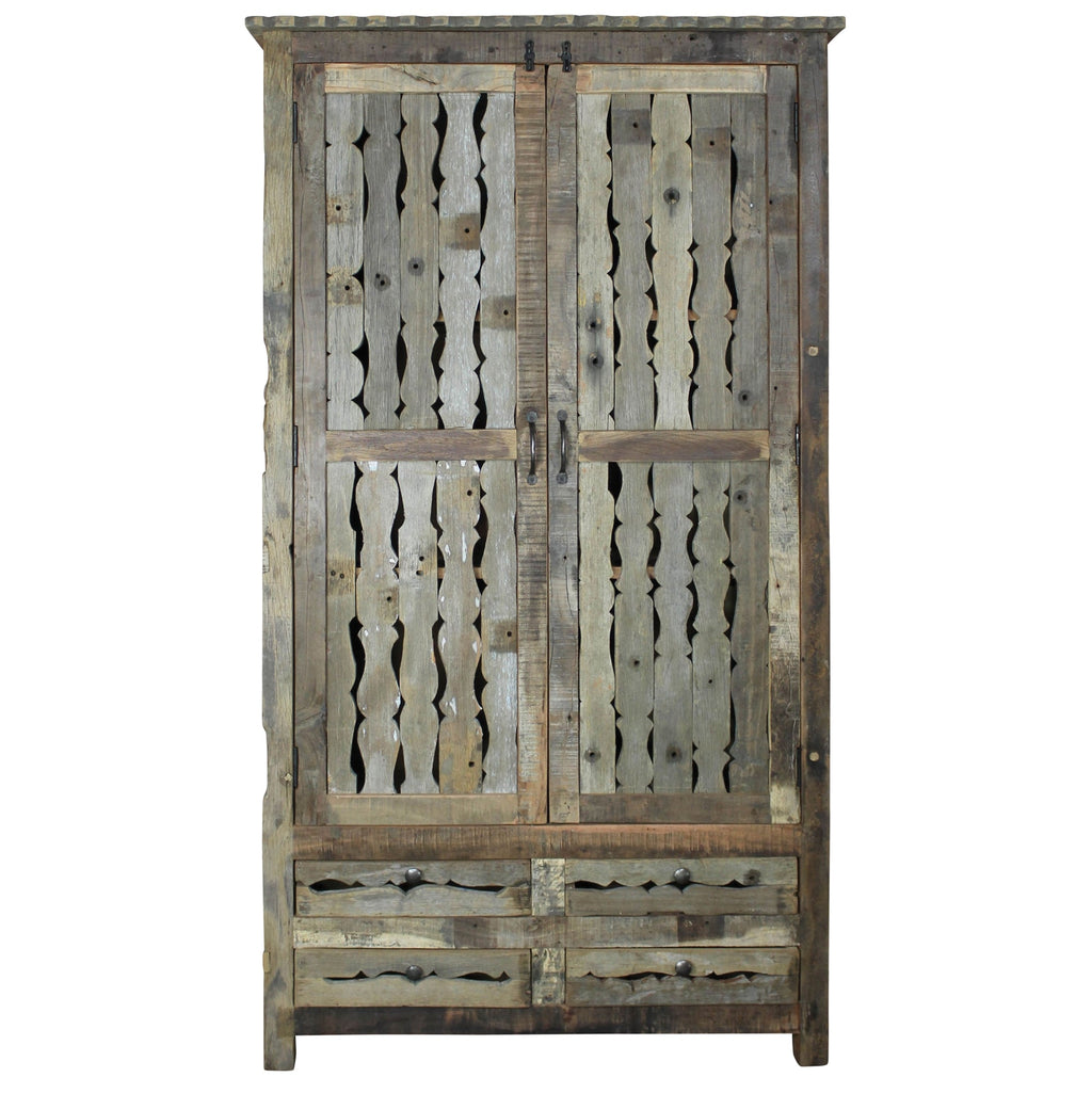 Crafted of salvaged, decorative wood slats this cabinet features 2 interior shelves, 4 drawers and endless opportunities for storage. As a rustic armoire or unique media console the homespun charm of this cabinet is here to make a statement. Dimensions: 37 x 18 x 71