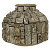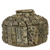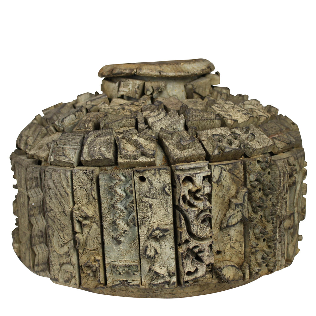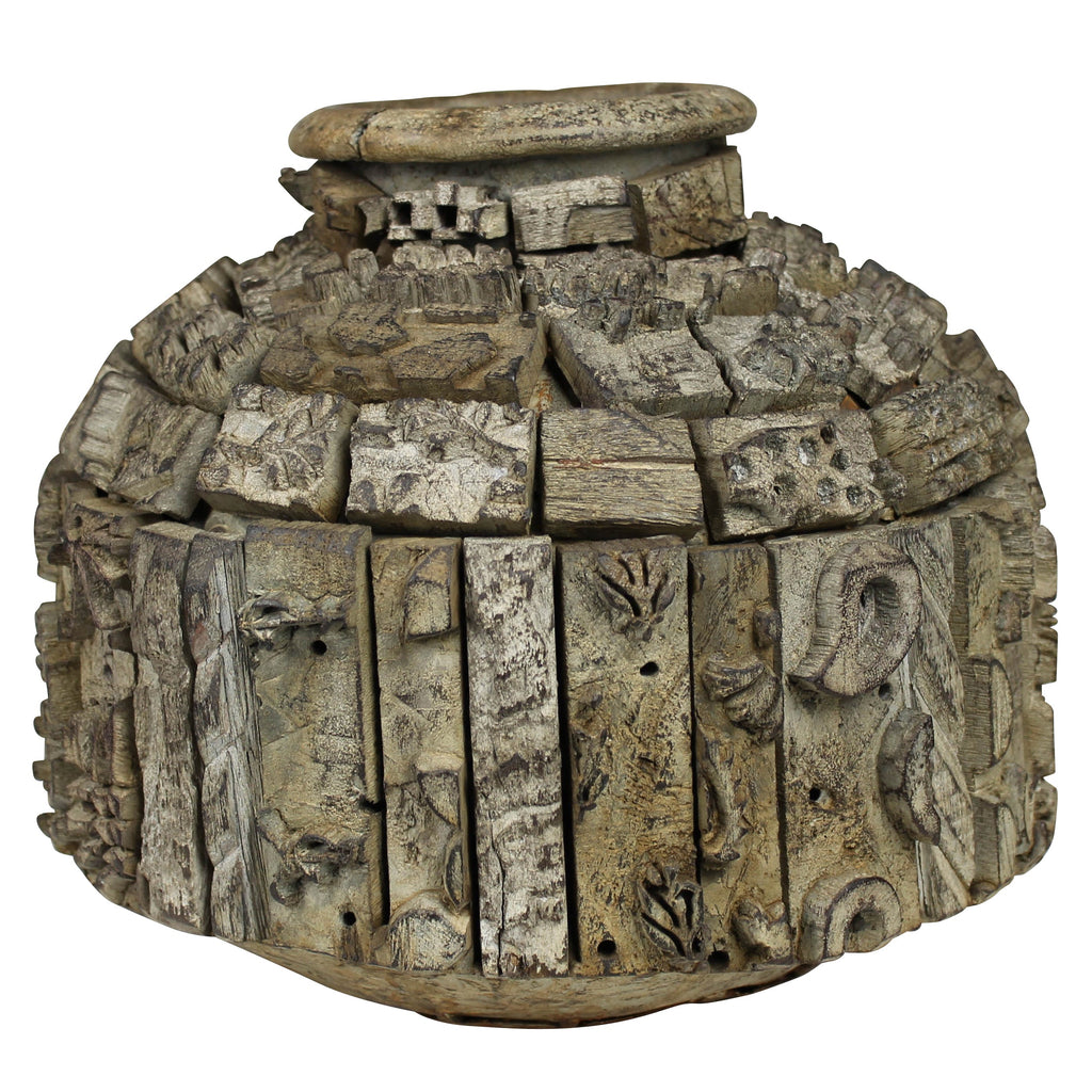 A vintage metal vessel once used for carrying water is given a decorative update enrobed in wood block prints. These two salvage materials combine to make a striking object. Not water tight. Each piece is unique, the shape and pattern will vary. .Dimensions: 11 x 11 x 10
