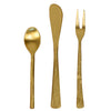 Sleek and refined this trio of brass utensils starts the party in the classiest of ways to serve hors d'oeuvres. Hand wash recommended. Set of 3: $4, $4.75, $5.50, Knife: 6x0.75, Fork: 5.5x0.5, Spoon: 4x0.75.Dimensions: 6 x 0.75 x 0.25