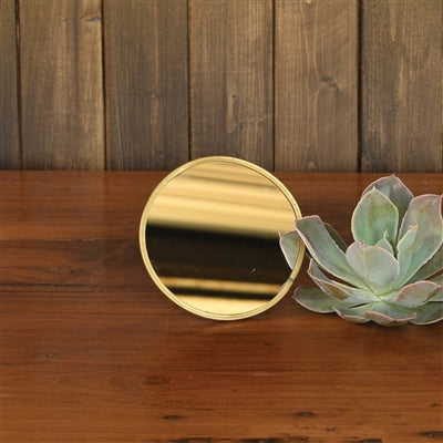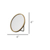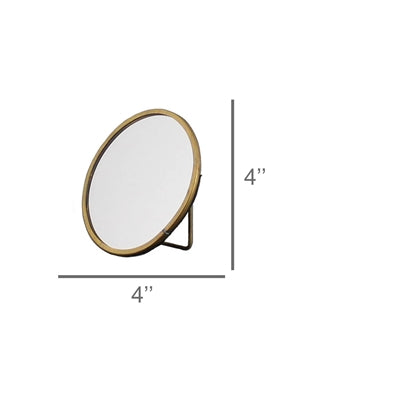 A thin brass frame surrounds a glass mirror, perfect in scale to add a bit of reflection in small spaces. Stands with a built-in easel. .Dimensions: 4 x 0 x 4