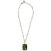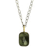 A limited edition production. This gorgeous piece of green garnet flecked with tourmaline has been hand cut to enhance it's brilliance and sparkle. Bezel set and hangs on an adjustable brass chain. 1.5" pendant on 18" chain 1.5" pendant on 18" chain.Dimensions: 2 x 0 x 1.5