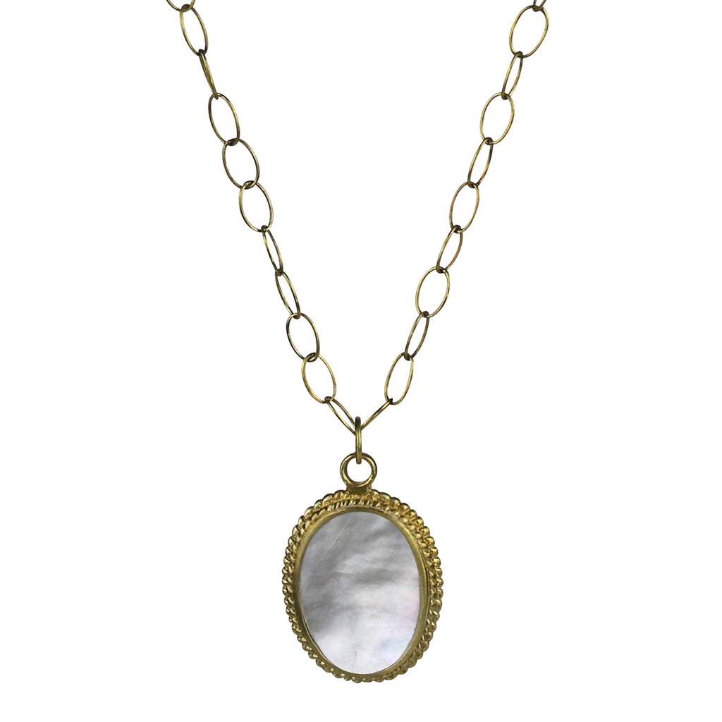 Hand carved Mother of Pearl is set into a cast brass medallion and strung on a handmade adjustable chain.