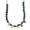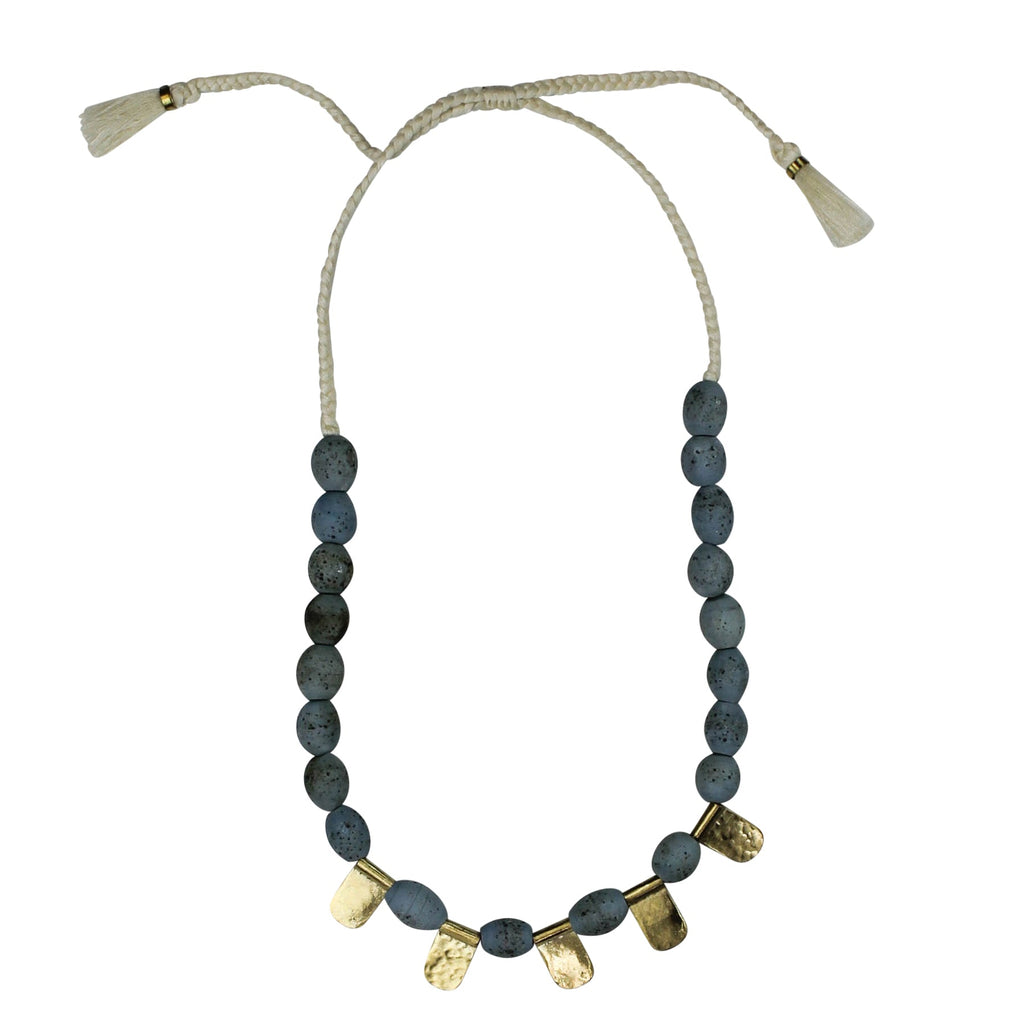 Brass necklace with sleek brass tabs and blue beads. The modern design offers a bold yet minimalist look, perfect for adding a touch of sophistication and texture to any outfit. 22ΓÇ¥ diameter, adjustable.Dimensions: 0 x 0 x 0