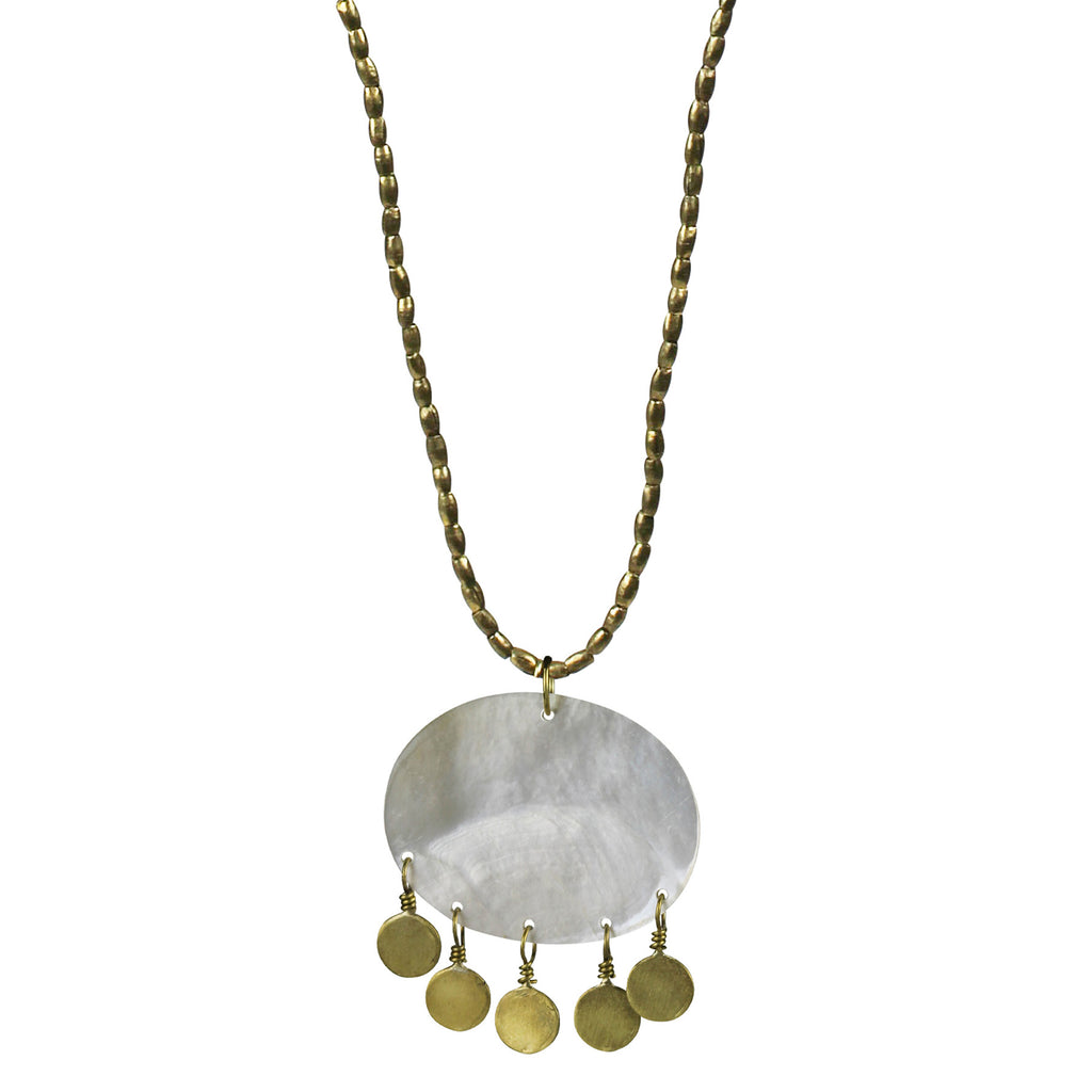 Mother of Pearl and brass disks create a statement pendant. Strung on an adjustable natural leather cord adorned with brass beads.