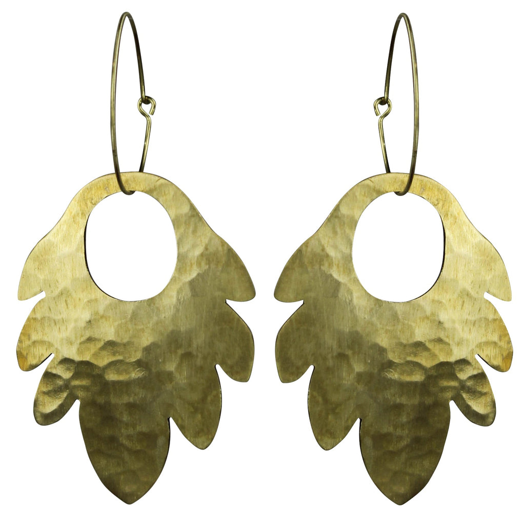 A pair of hammered brass earrings shaped like Philodendron flowers. The textured finish and warm metallic tone create an elegant, nature-inspired look, capturing the graceful beauty of the flower in a striking, timeless accessory. .Dimensions: 1.5 x 0 x 2.25