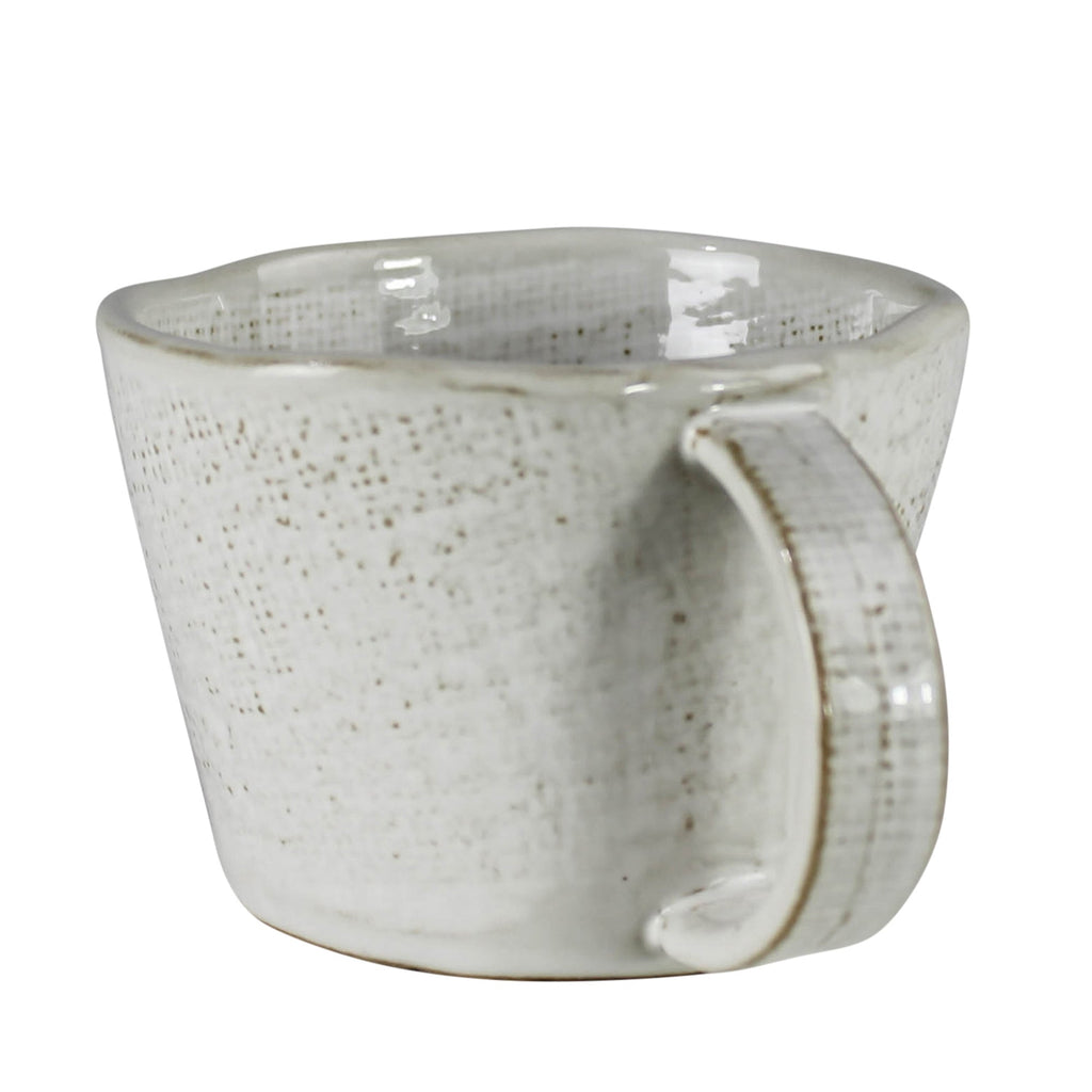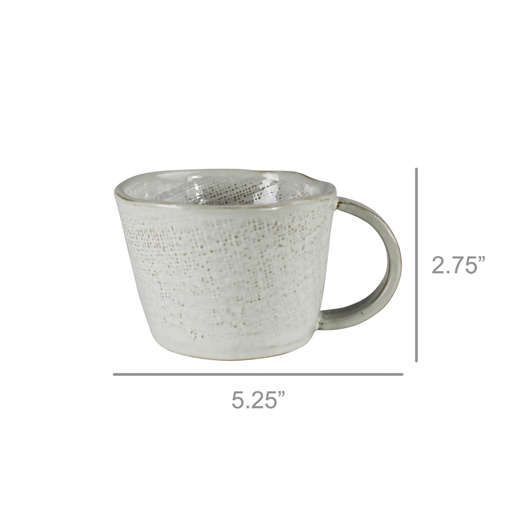 A mug to wrap your hands around. Ceramic embossed with a linen texture. Dishwasher and microwave safe. .Dimensions: 5.25 x 4 x 2.75