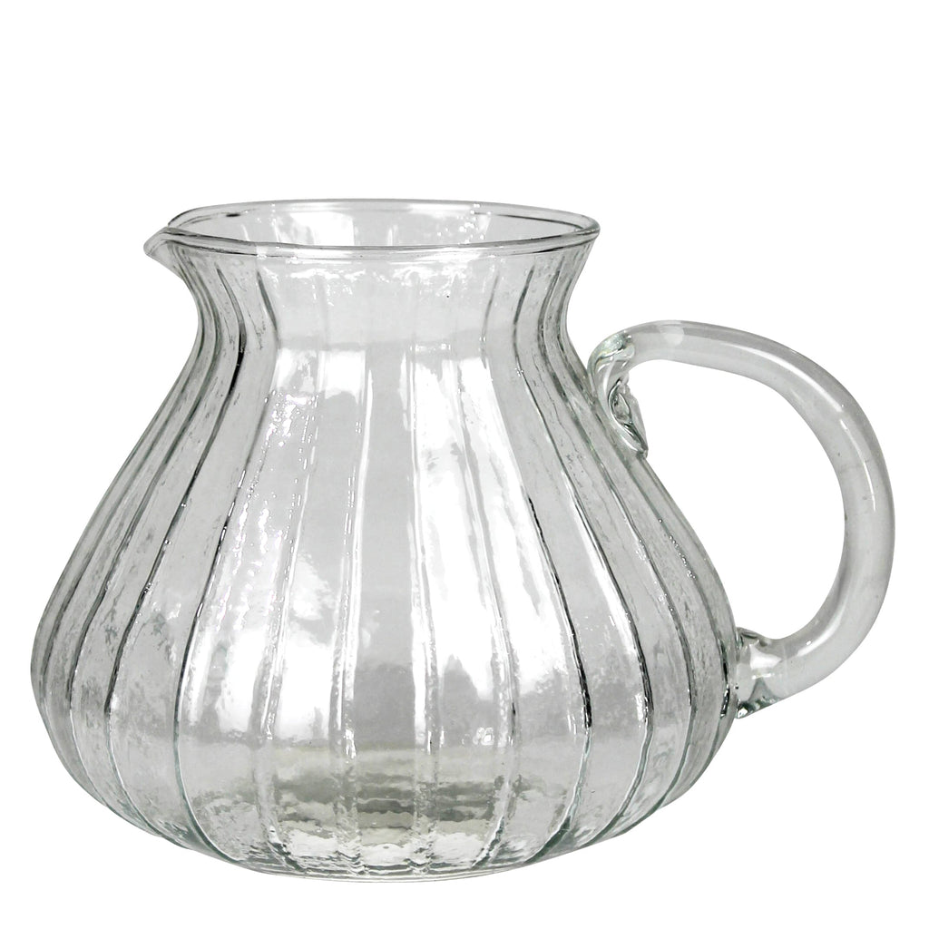 A modern glass pitcher with a low profile and ribbed design, offering both style and functionality. Its sleek shape and textured surface make it a perfect addition to any table, adding a touch of elegance to serving drinks or as a decorative piece. 36 oz capacity.Dimensions: 7 x 6 x 5.25