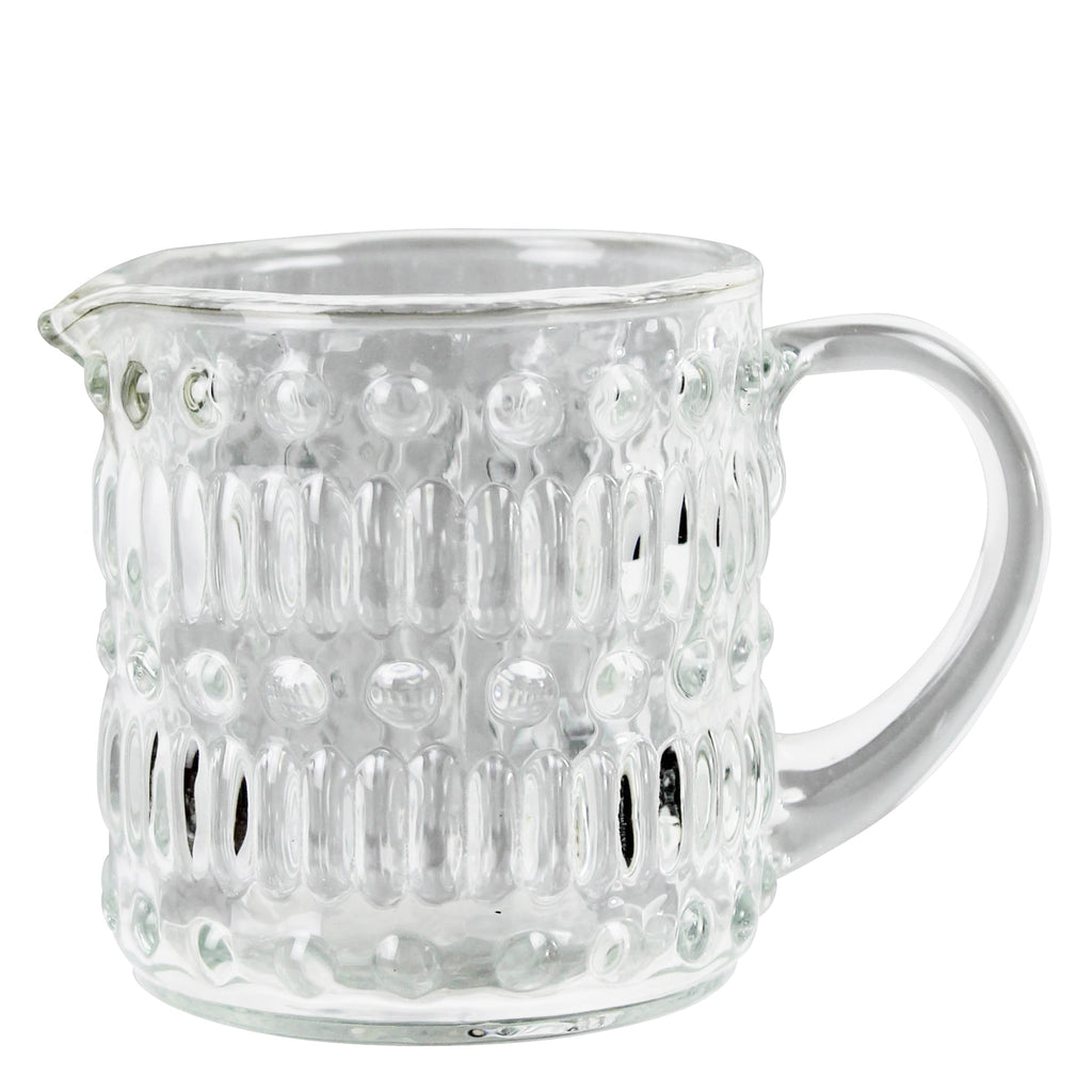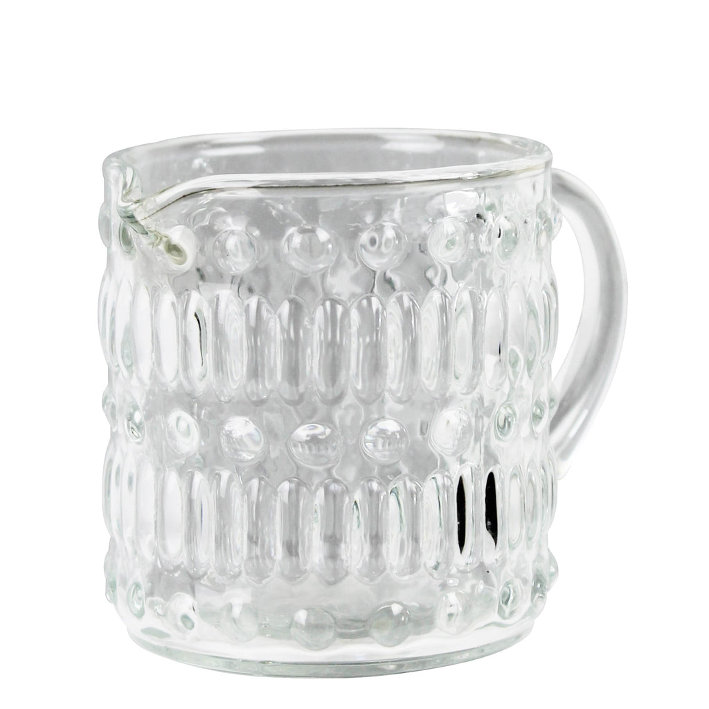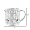 A modern glass pitcher with a small profile and embossed design, offering both style and functionality. Its sleek shape and textured surface make it a perfect addition to any table, adding a touch of elegance to serving drinks or as a decorative piec 8 oz capacity.Dimensions: 5 x 3 x 3.5