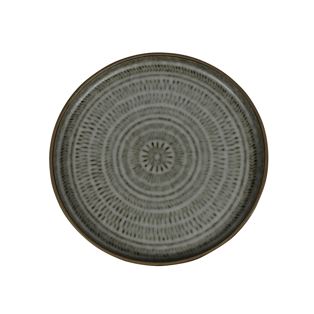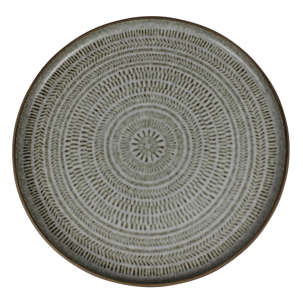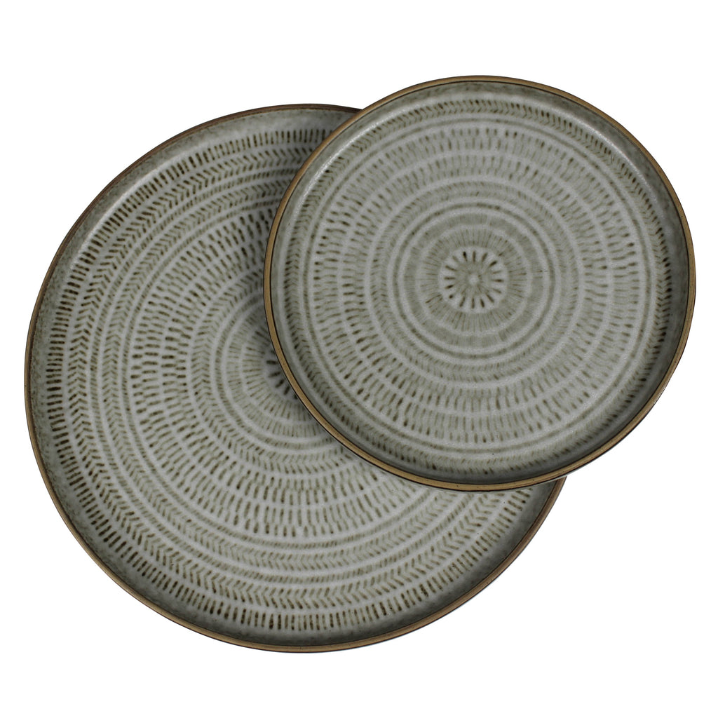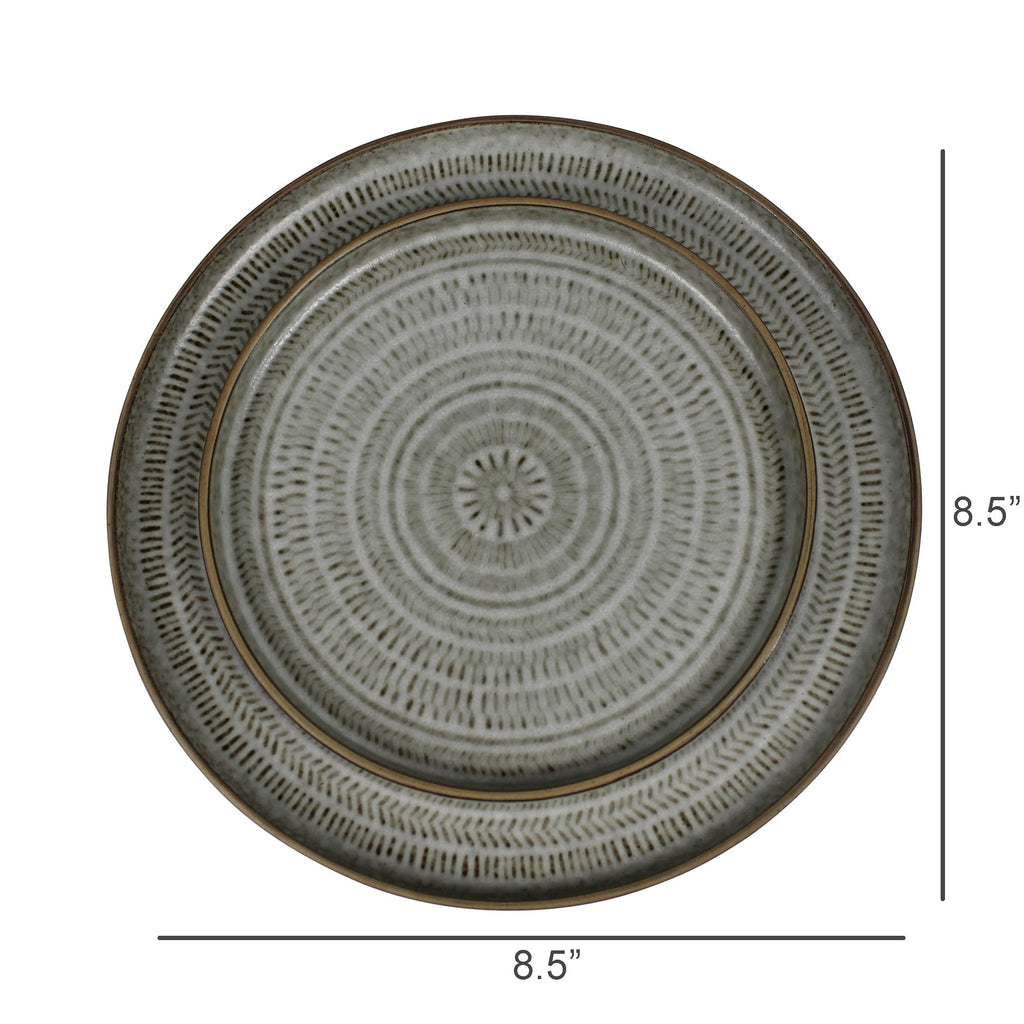 The embossed texture and hand applied glaze of this duo of plates lends handmade styling. Used as a salad and dinner plate, the table is set! Food and dishwasher safe. Sm: 6.25x0.5, Lrg: 8.5x0.75.Dimensions: 8.5 x 8.5 x 0.75