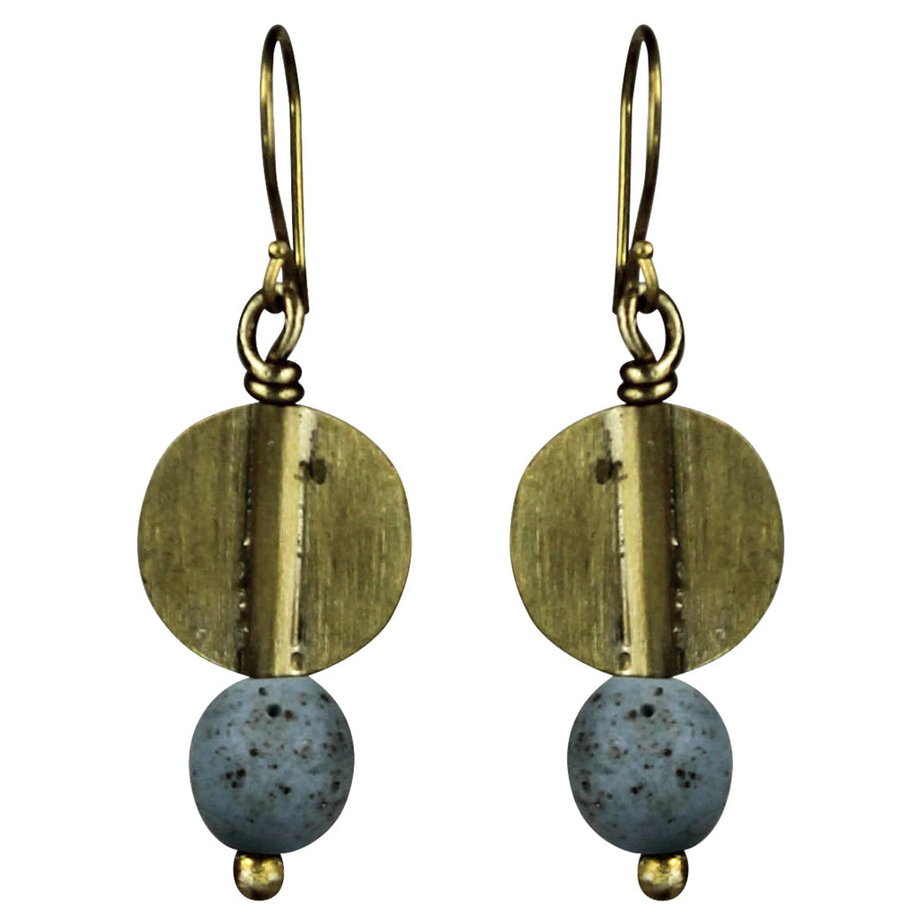 Brass earrings featuring a round disk with a blue bead hanging below. The clean, minimalist design creates a sleek, modern look, with the delicate bead adding subtle movement and elegance to any outfit. Perfect for both casual and formal wear. .Dimensions: 0.5 x 0 x 1.5