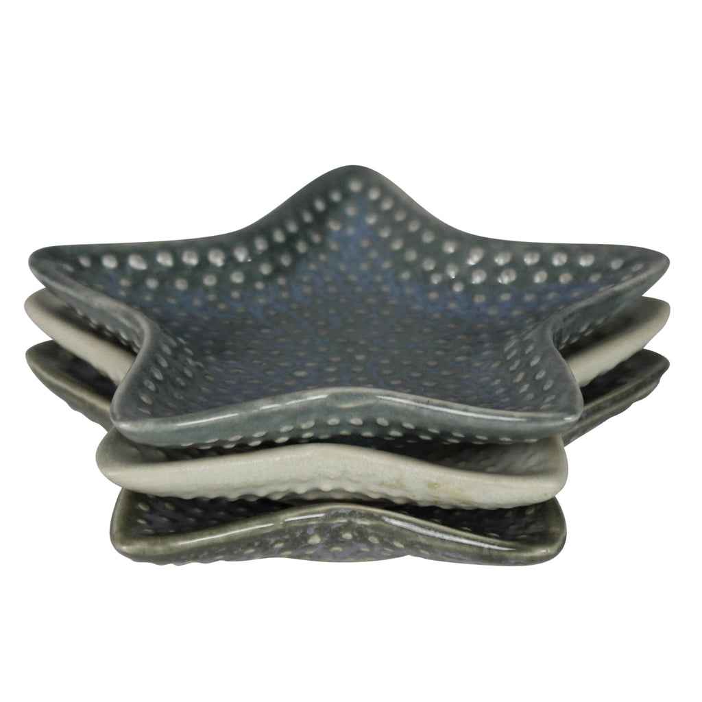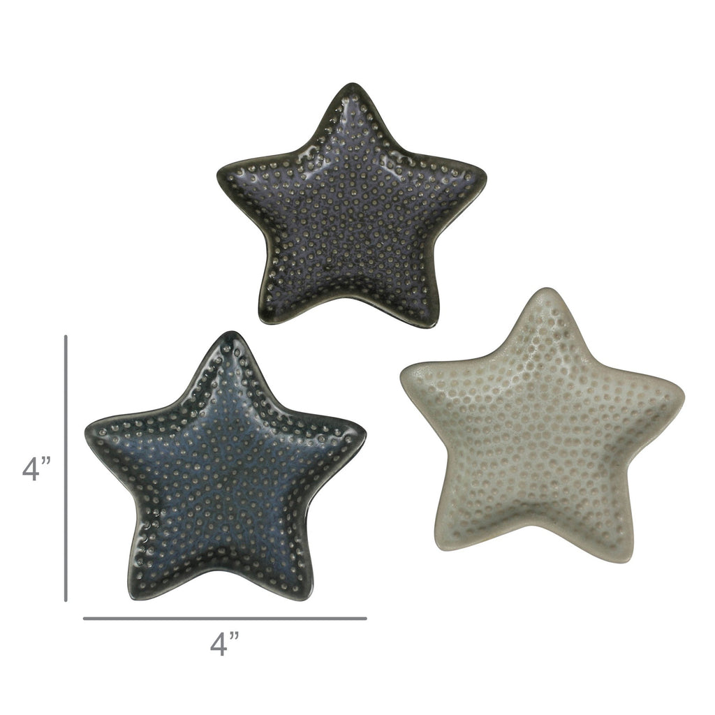 This trio of sea star trays are a coastal inpired catch-all but also food safe for nut, olives and pits. Food and dishwasher safe. .Dimensions: 4 x 4 x 0.75