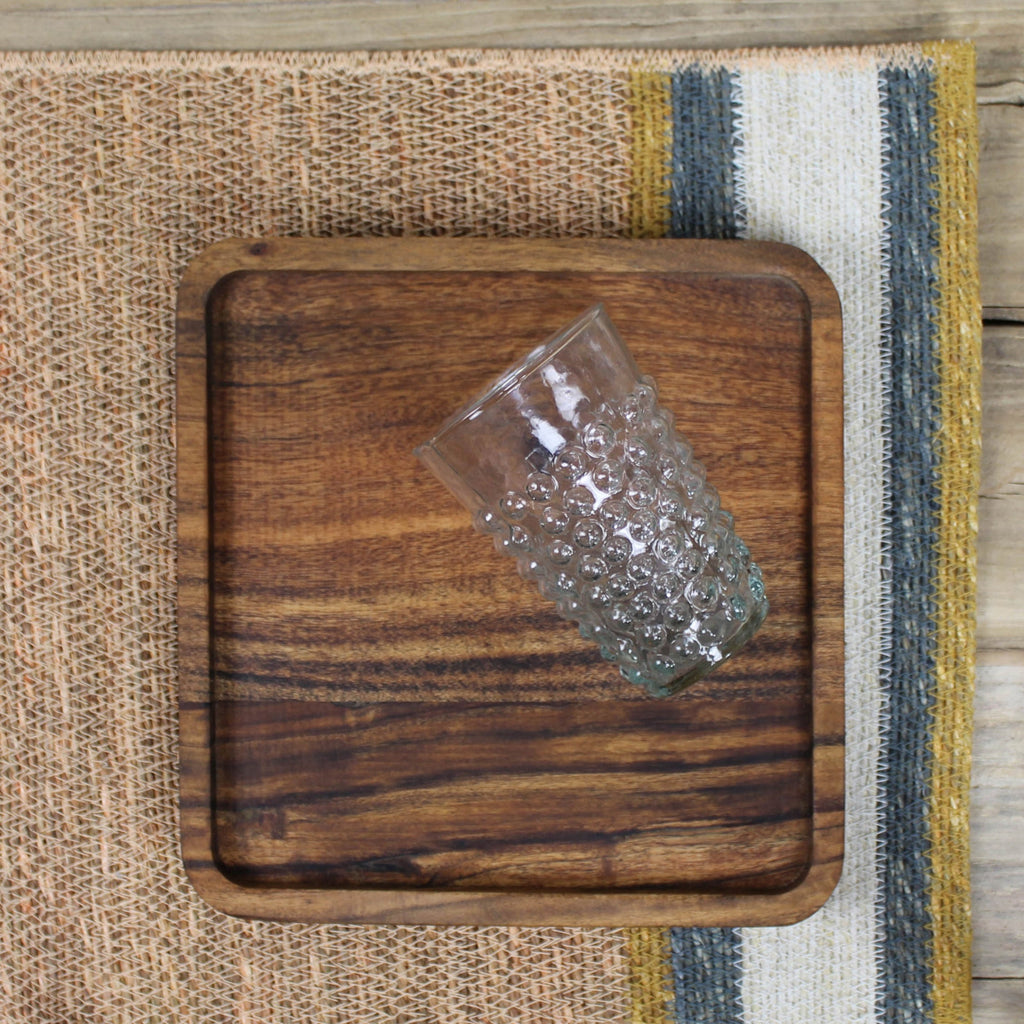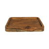 Crafted of acacia wood this versatile tray will be the new entertainment staple. Acacia is known for its exceptional durability. The hue and wood grain will vary. Rinse with soap and water and dry immediately, apply oil as needed. Prior to packing each piece is rubbed with oil for longevity and the oil may transfer to paper, this is non-harmful. .Dimensions: 9 x 9 x 1.25