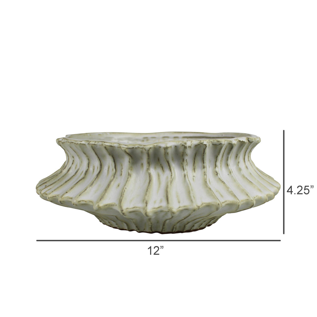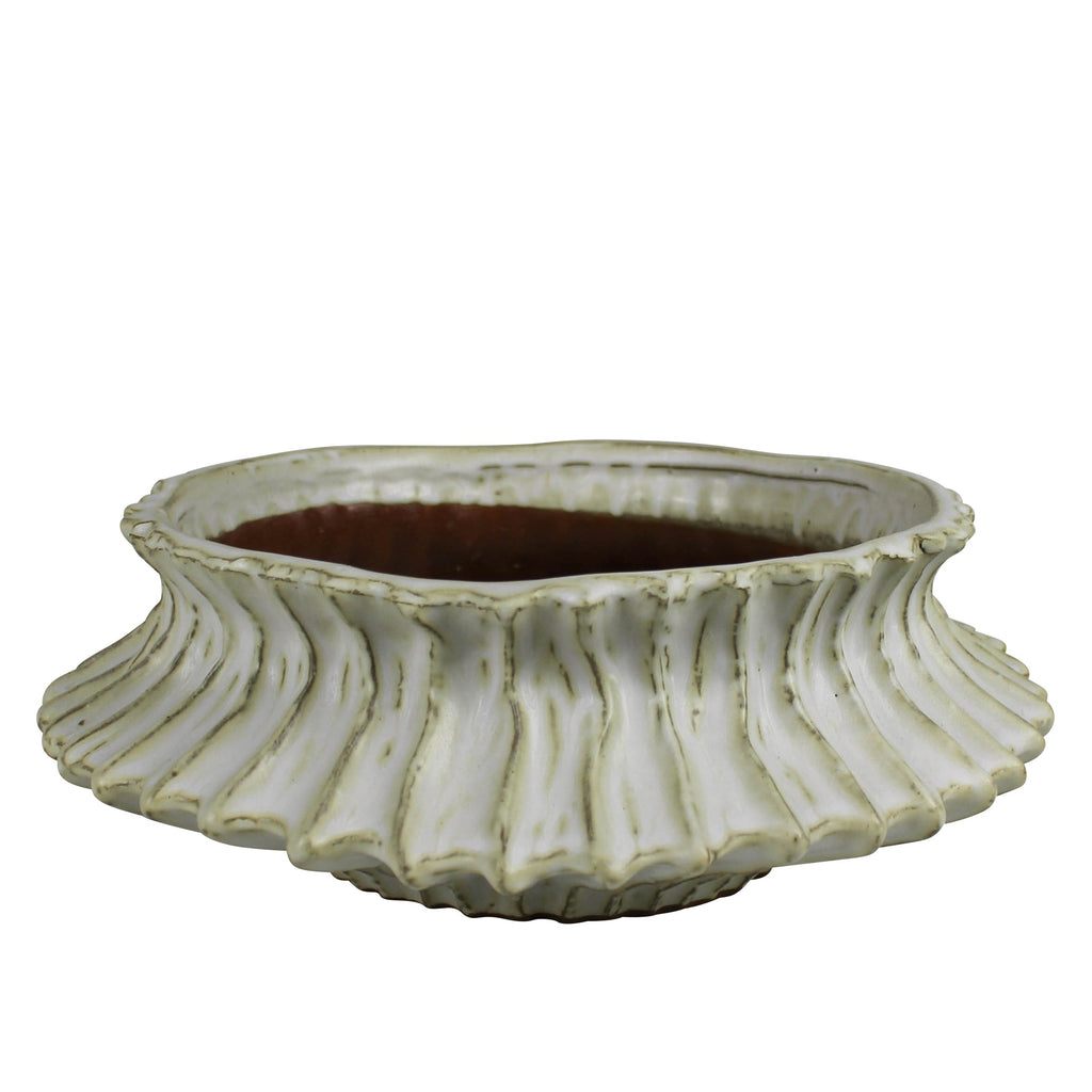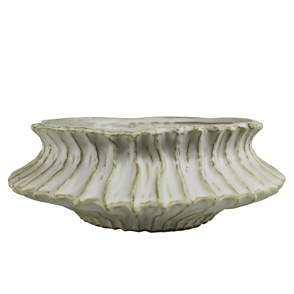 Crafted of heavy stoneware, the ribbed details and authentic glaze of this vase create a statement worthy vessel. .Dimensions: 12 x 12 x 4.25